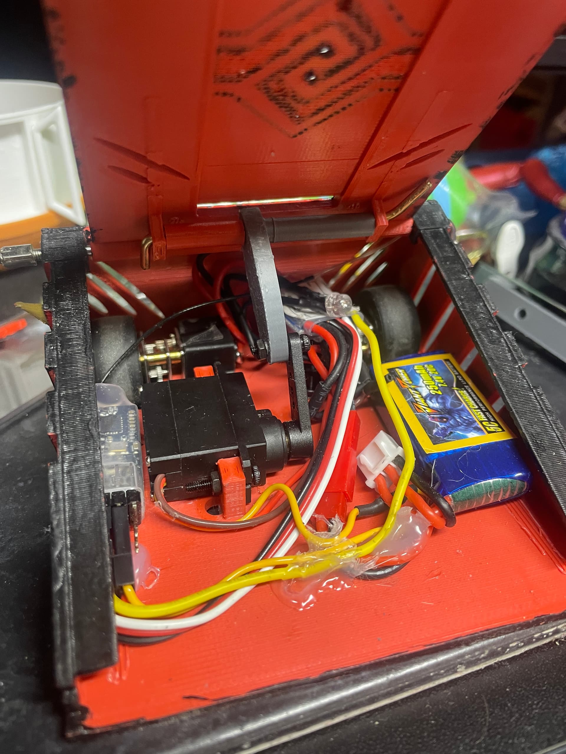 As much as it looks like it, it’s not hot glue fortunately, it’s a silicone on the wires so it shouldn’t melt anything. You’re right on the battery wire though. I’ll try to get that held in another way. The battery is sitting on a tiny piece of Velcro so it’s held in, but also has a little give for bumps, and can just be ripped out in a hurry.