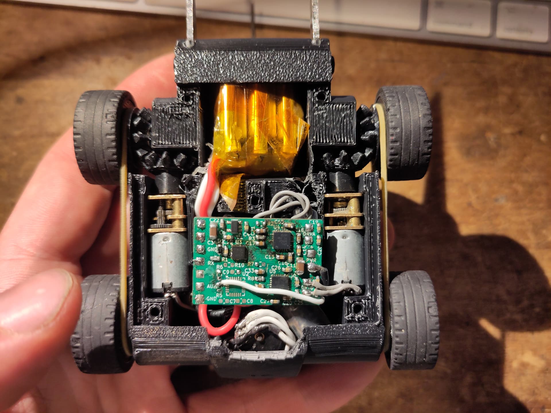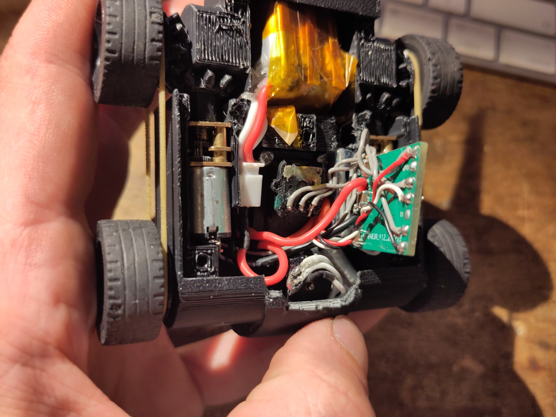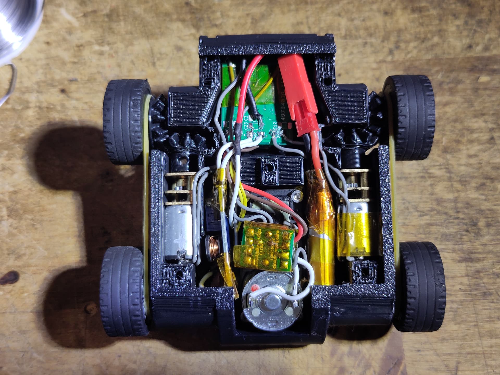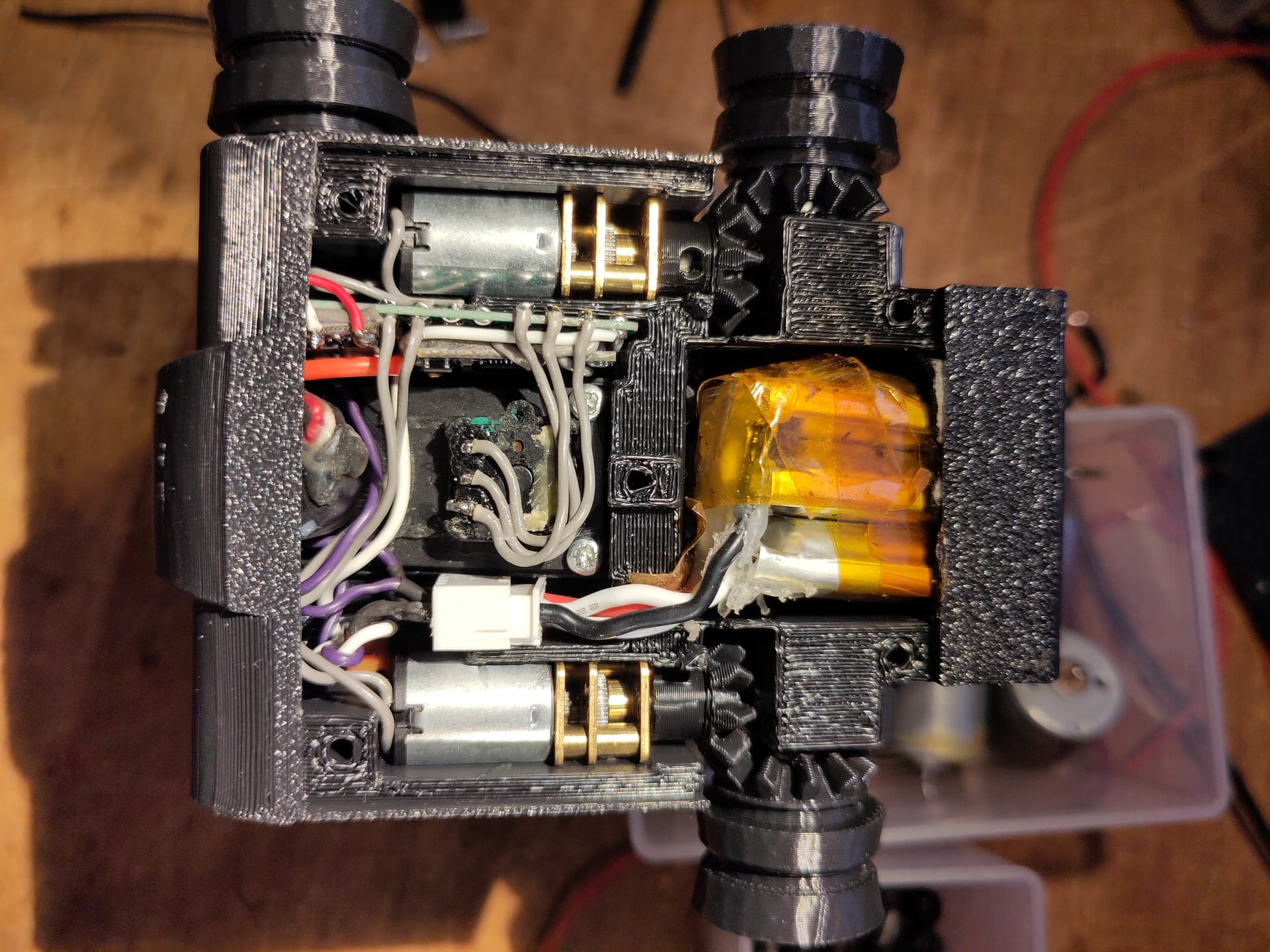 Turns out that when shaved to within an inch of its life with flush cutters, this one does. I used the one weird bevel gear trick (again) to run the motors longitudinally, parallel to the servo, but with gears 3D printed into the wheel hubs*. This gives just enough room in the remaining space for the same 1s + 12v boost converter setup that Fatal Deviant uses, although I had to forgo the gyro on this PCB because I needed the pins for the motor driver IC hanging off the back of the servo.
