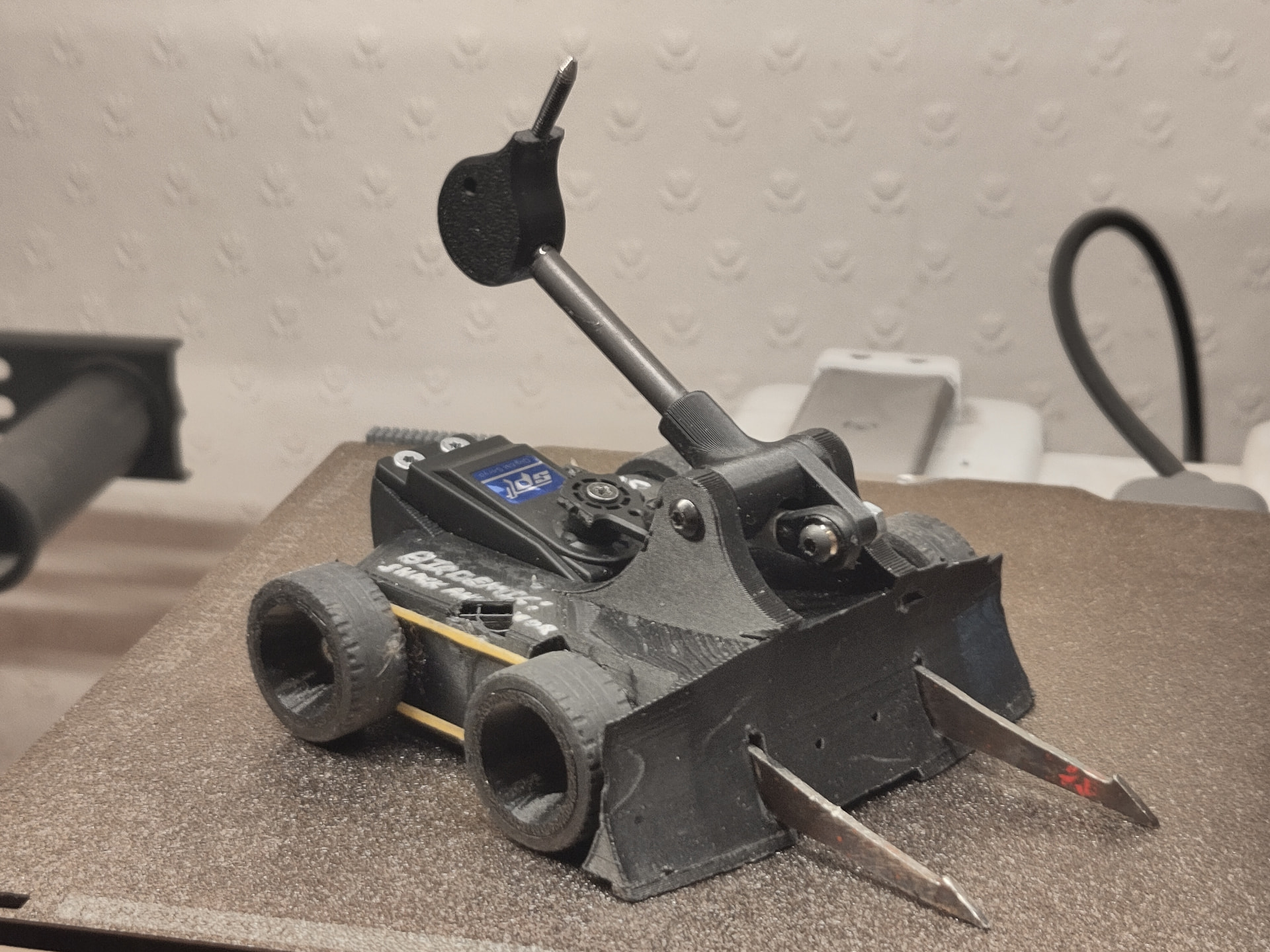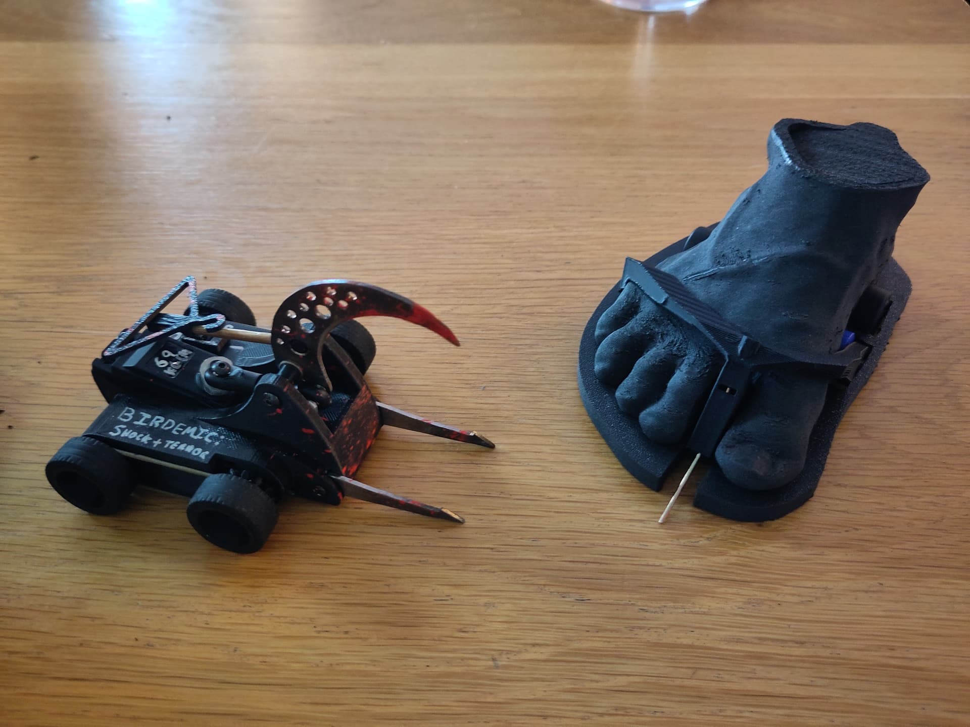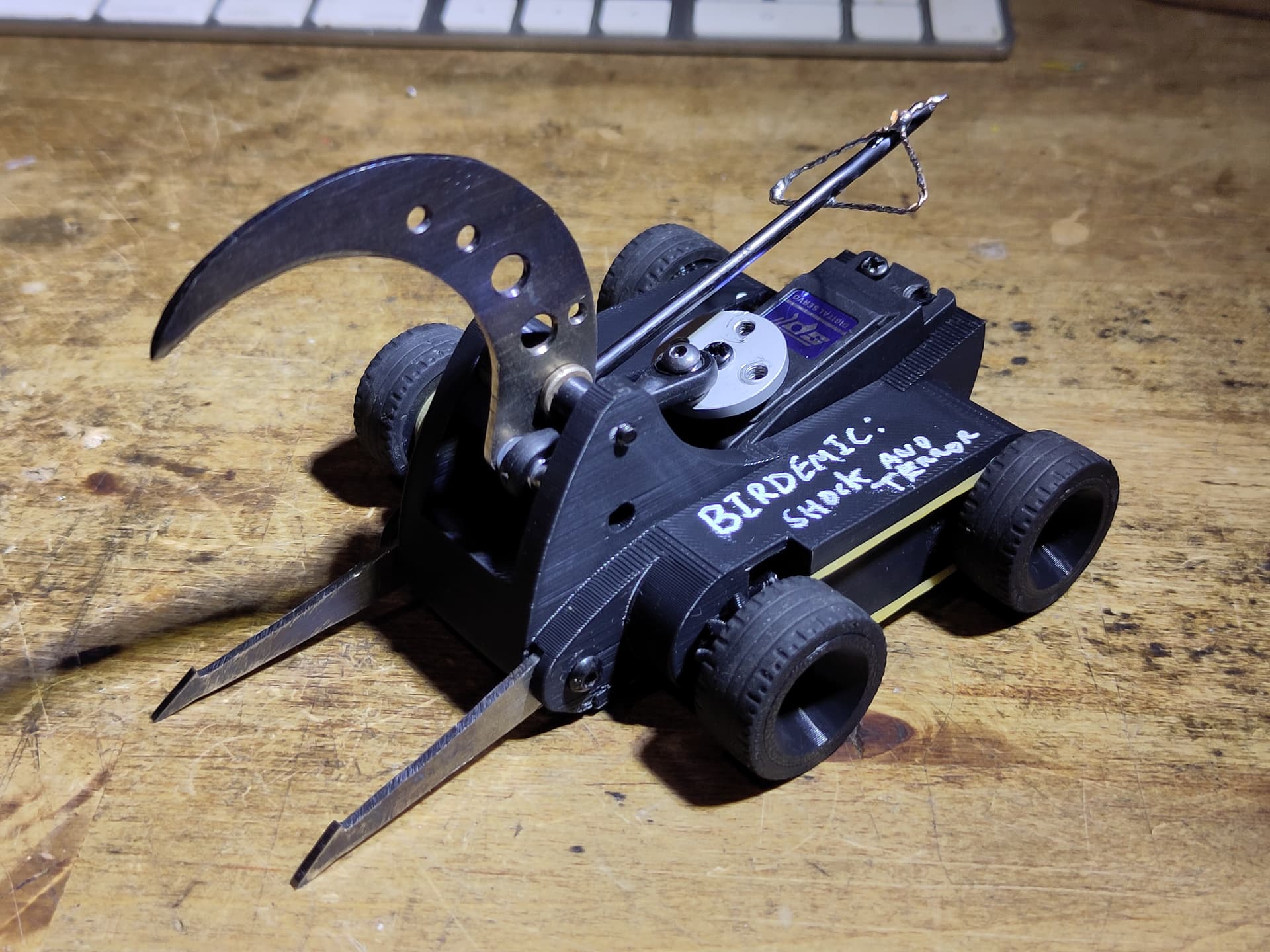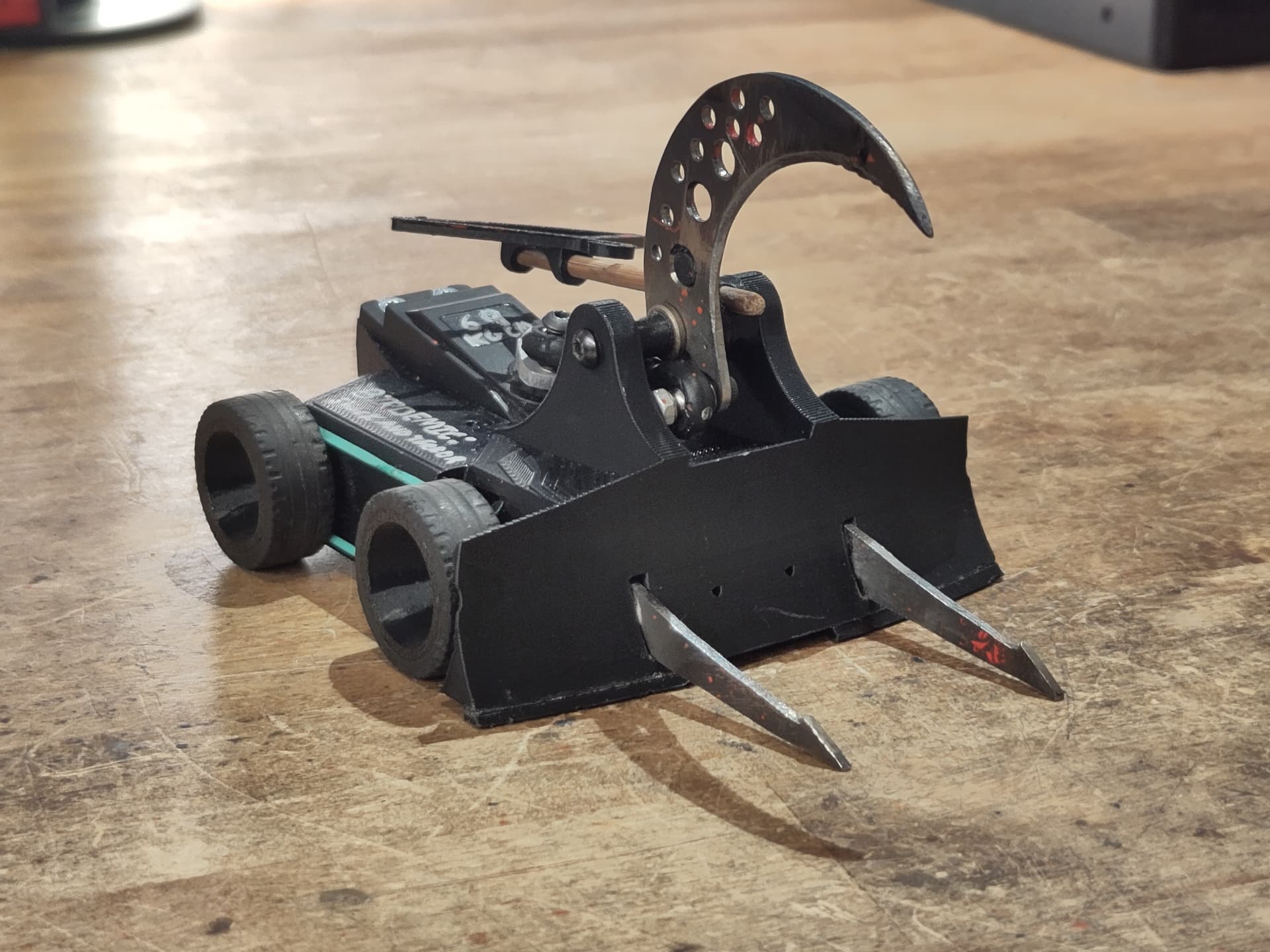 It managed to make it to ORCS for some whiteboards, where it performed really well for a bot finished at midnight the night before. It drove pretty good, was able to self right (before the self righter glue came unstuck), and got some good grabs in, including one on the arena wall on its way into the pit, allowing me to throw the robot back onto its wheels inside the arena and into the fight again.
