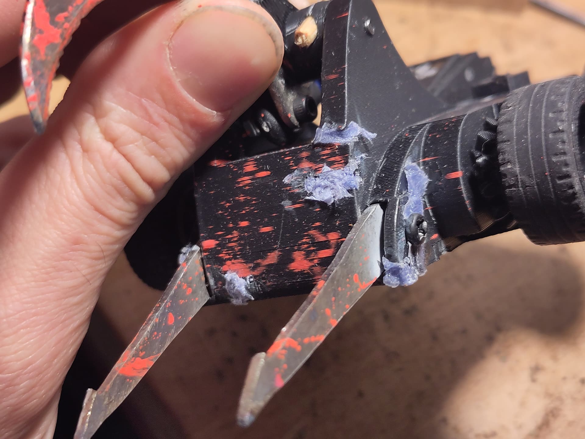 For future improvements, a custom PCB is in the works. This will cut down on wiring spaghetti, and also allow me to move away from the boost converter to a real 3s pack. Currently the weapon is current limited by the boost converter to 1-2A and acts mostly as a grabber, but the final goal is for it to perform as it does here, when allowed to pull its full 5A-6A stall current: https://youtu.be/-fP4krnDY-w