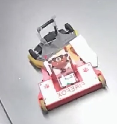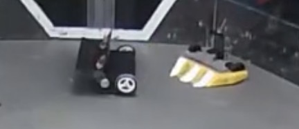 This is where things get crazy. Firefox is a 90-degree servo flipper with massive forks. So, what did I do? Strap giant strips of card to my robot (to get under Firefox). They did work for a while.