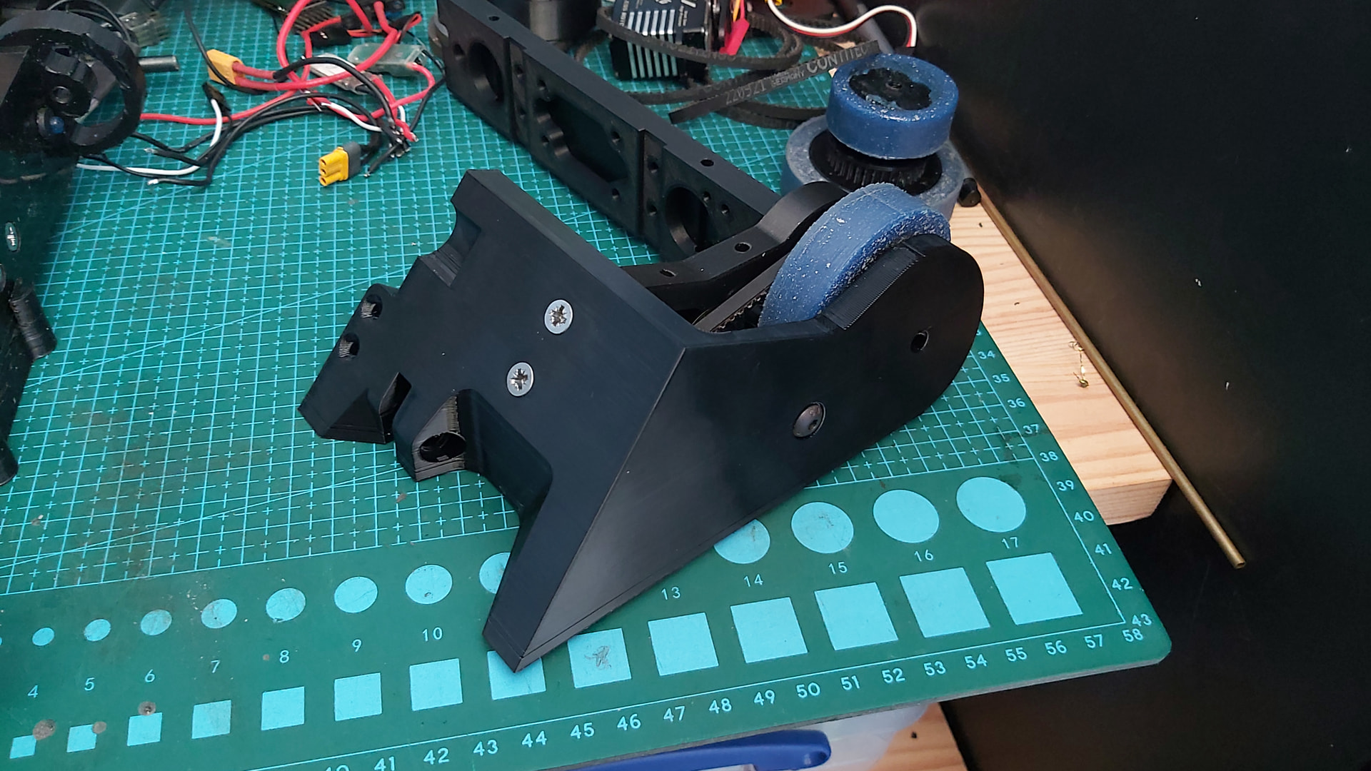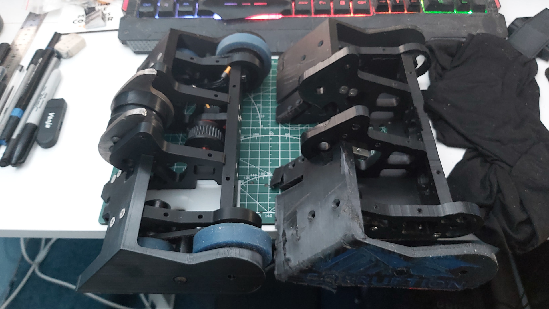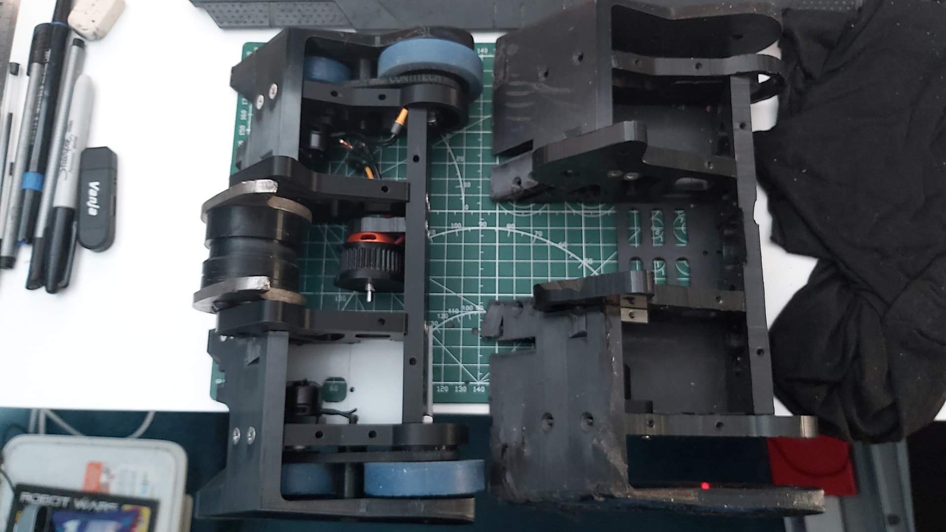 In April, I realised a rather glaring issue with the design that was important to change. The back of the robot was made up of 3 sections, with the middle being a TPU part that doubled as the motor mount. Hindsight makes us fools of us all