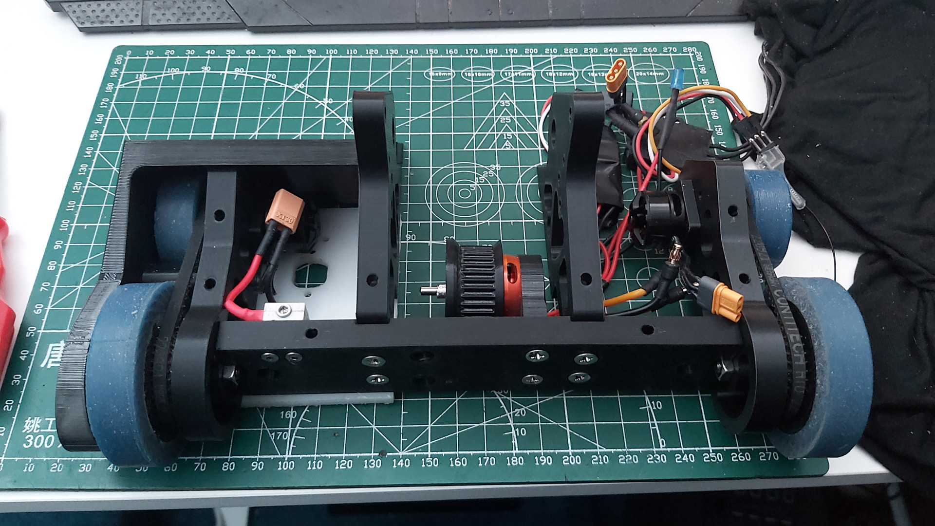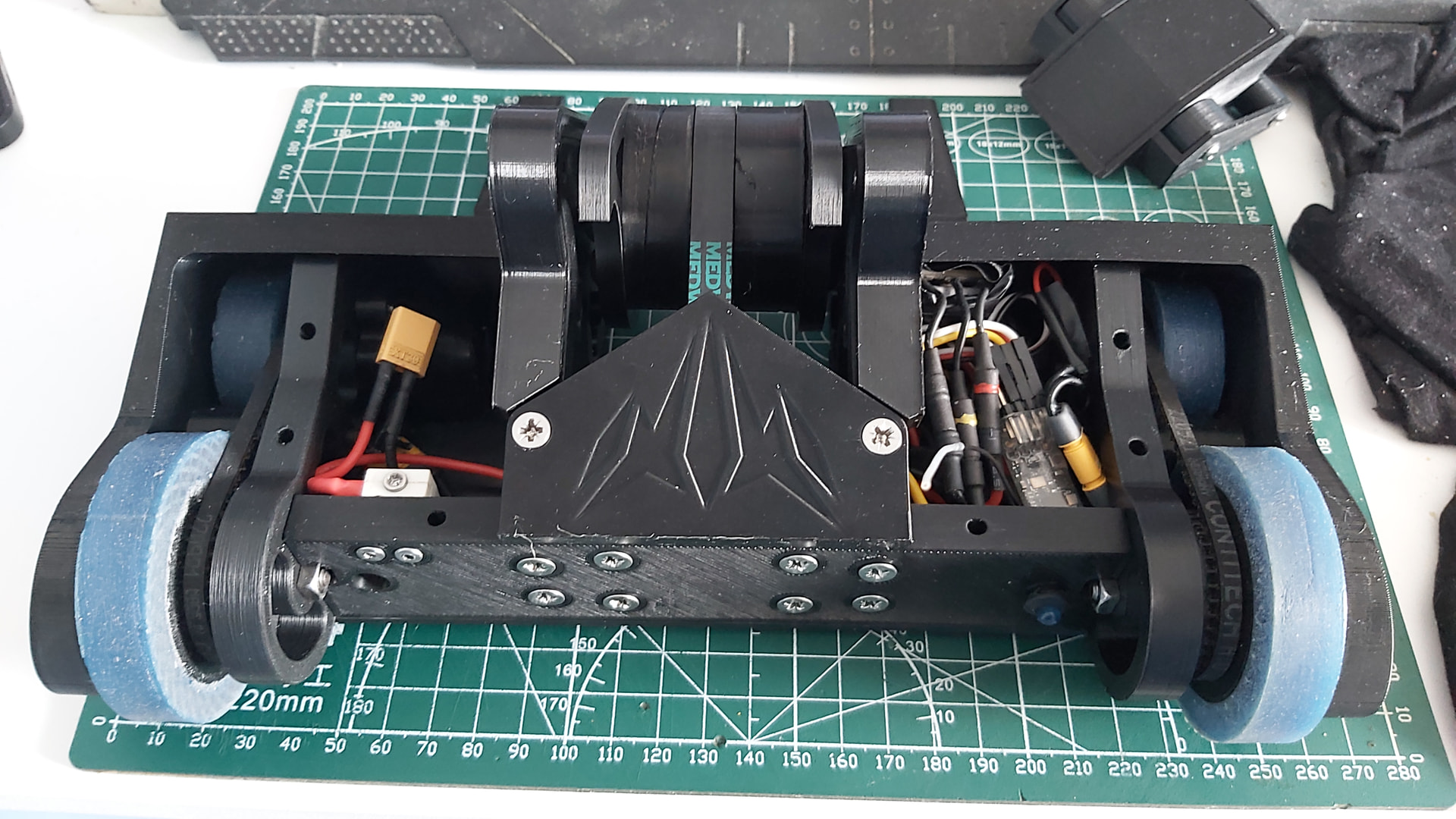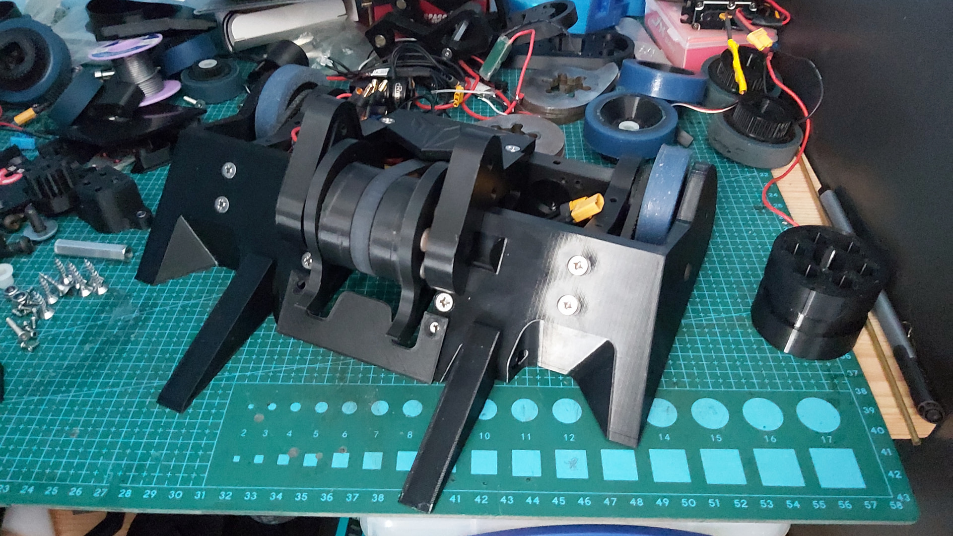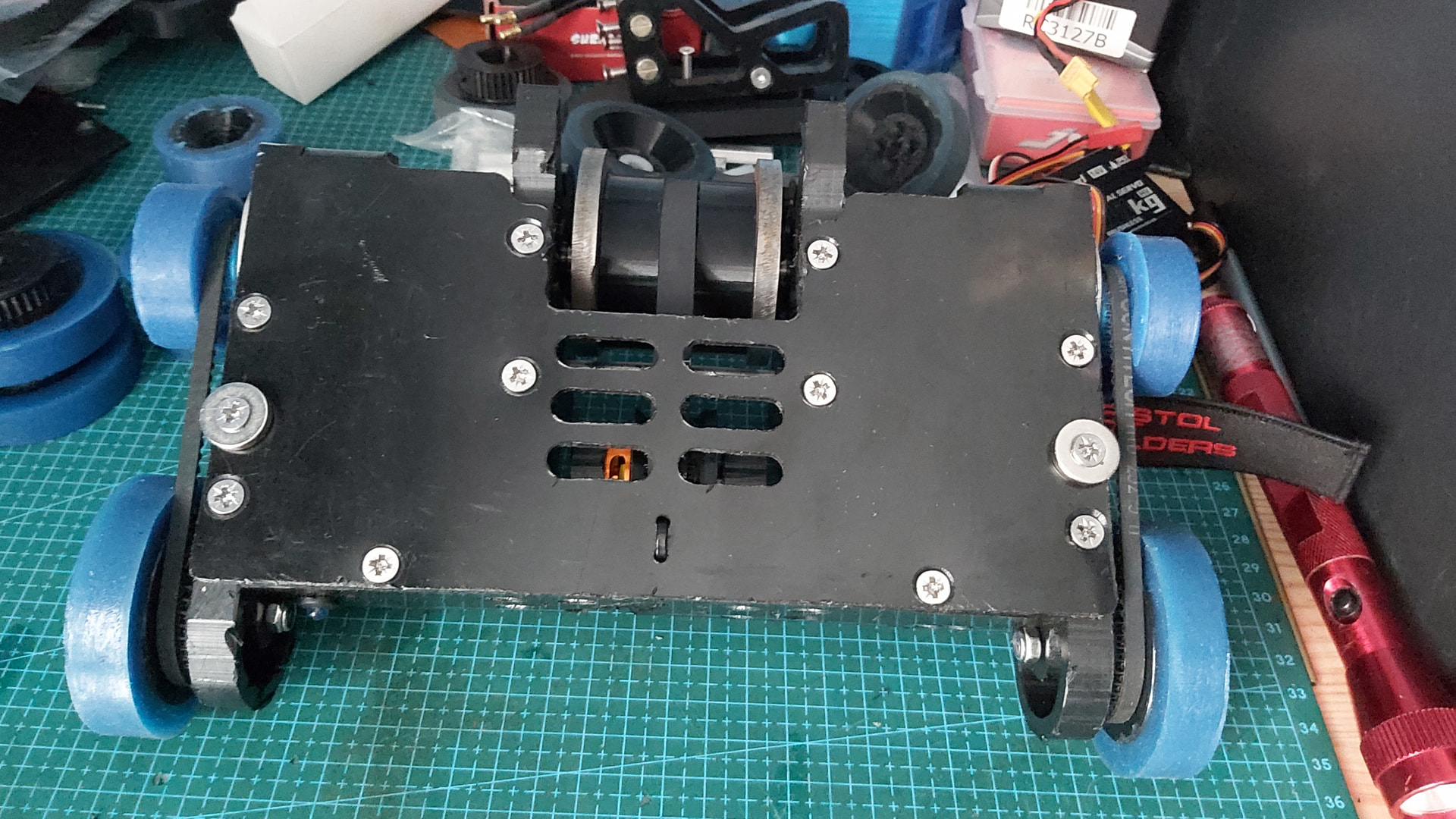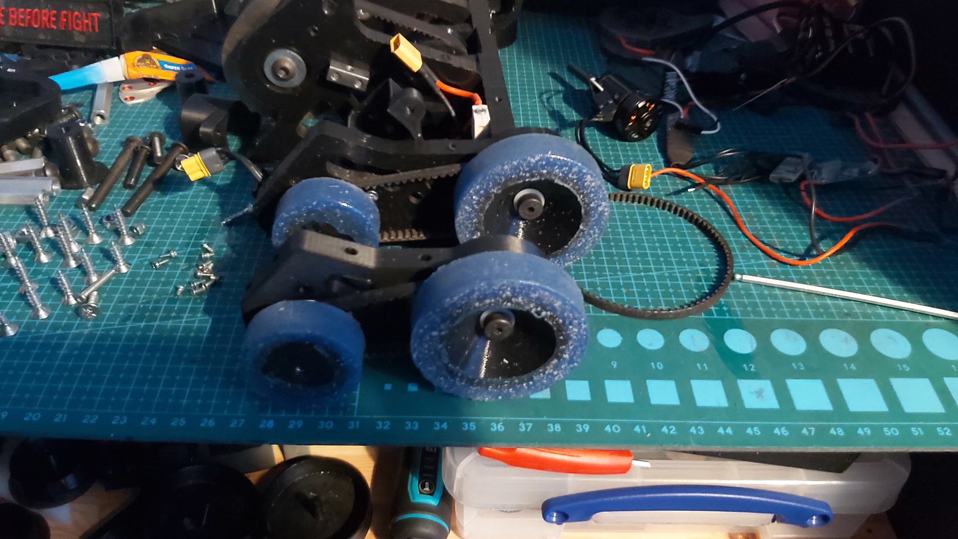 With a pile of old parts lying around, I placed them together to see what ideas would form. Rather quickly, the idea formed a 4-wheeled bot with small front wheels and big back wheels driven with my old 22mm brushless converted gearmotors and the drive belts from Data Breach MK1-MK2.