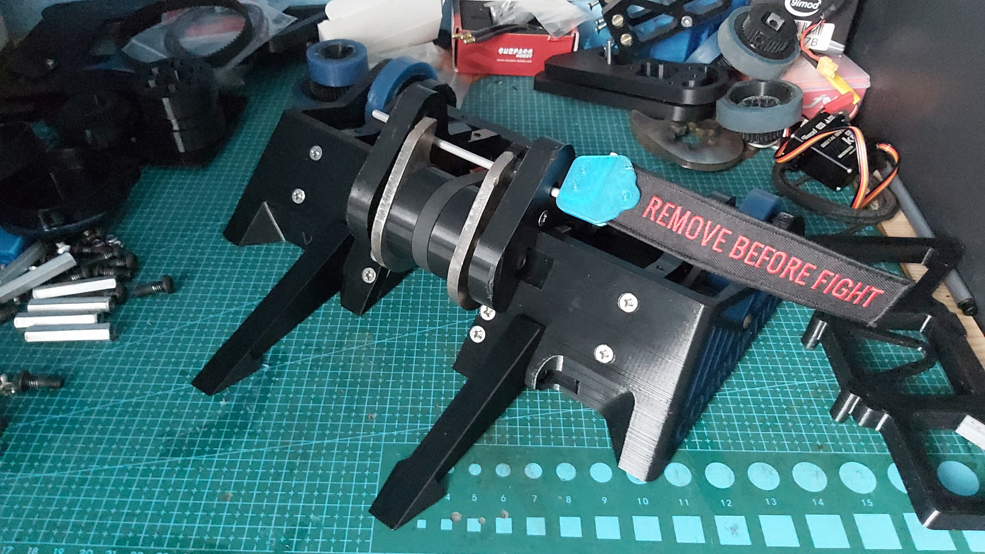 The first tpu wheel and the weapon pulley test fitted. The pulley is fitted over a Flash Hobby D-series brushless motor. The inside of the pulley has been designed to interlock with the motor can. The bolts were simply to keep the pulley in place.