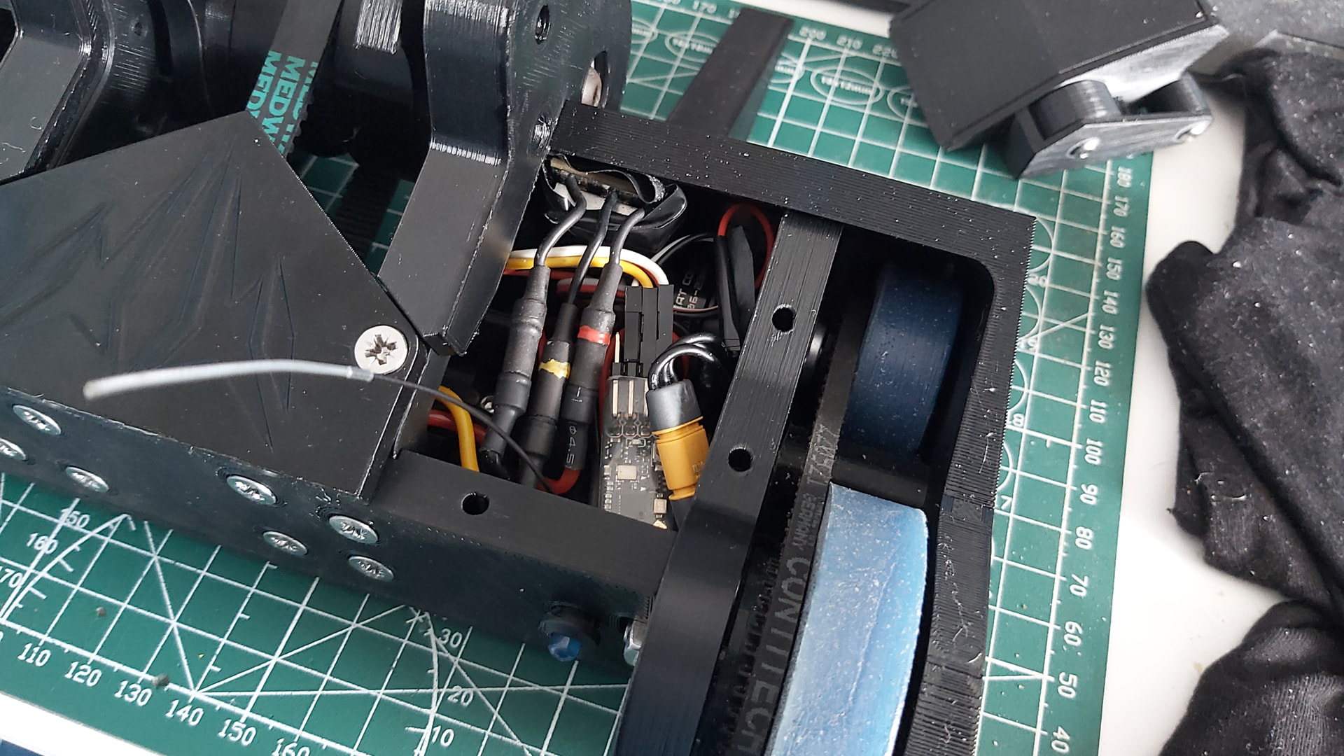 The wire loom was divided between both sides of the bot. The left side housed the FT switch, left drive motor and the battery, while the right side housed the right drive motor, main wire loom, fuse, LED and all the ESCs. The drive ESCs were two BBB brushless ESCs, and the weapon ESC was the Repeat Robotics Vortex 80A ESC. You can also see the weapon motor mounted in the middle while being supported on both ends.