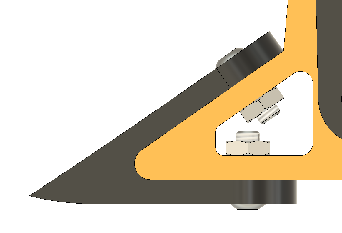 For damage, a 20g metal tooth is mounted on the tip of the robot with two M4 screws. It is 3 millimetres thick, so it should be plenty for an antweight fight. It is more likely that a hit to it will break the robot than the tooth. I am still debating whether to make this by hand or get it plasma / laser cut. For PLAnts, I may use a polycarbonate copy of this, which would be easy to swap out on the day.