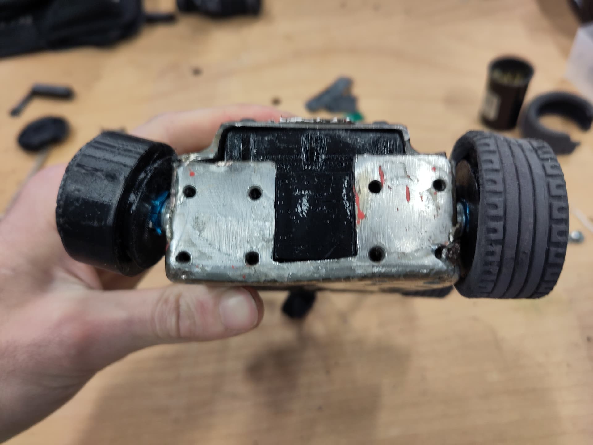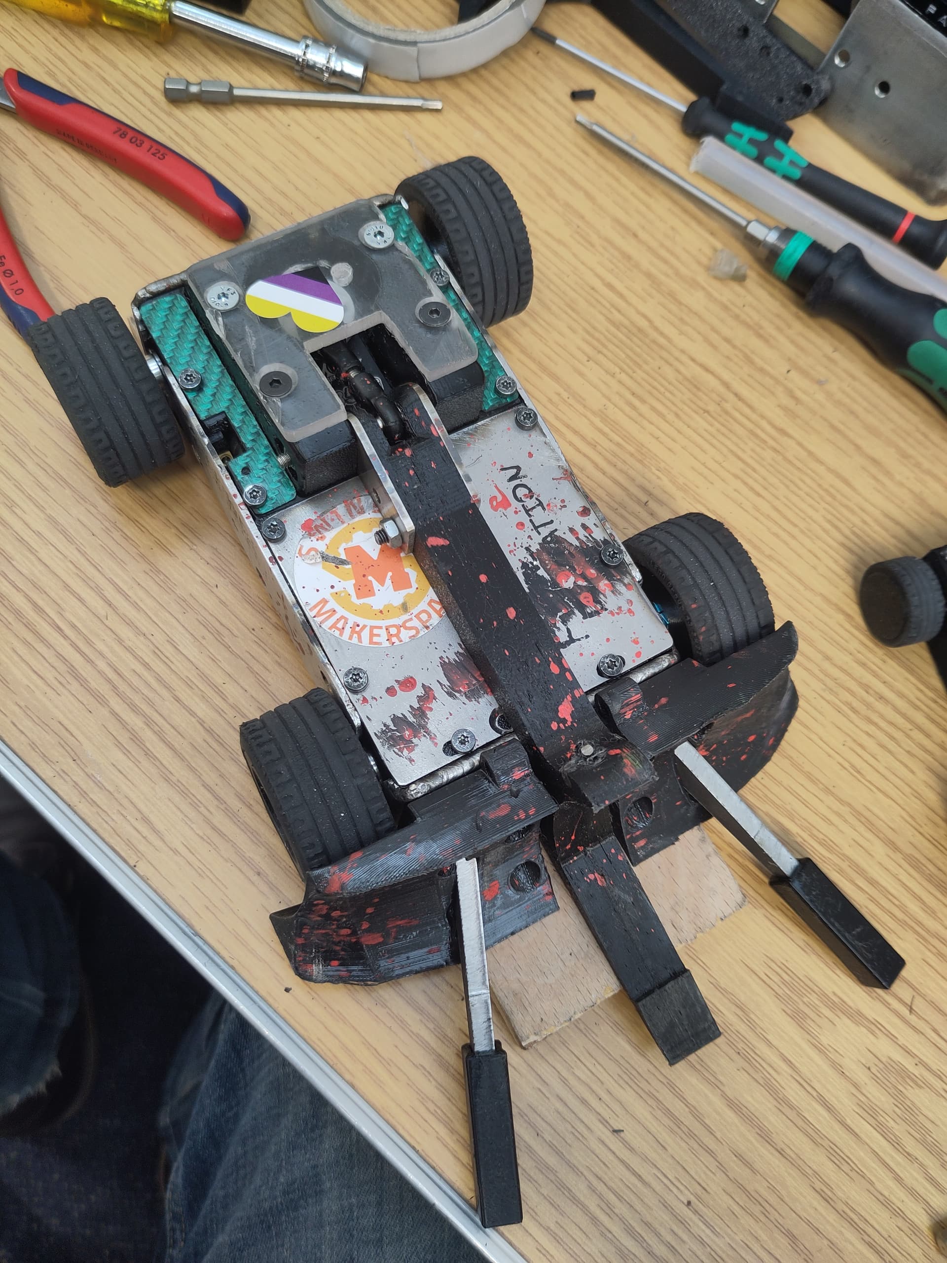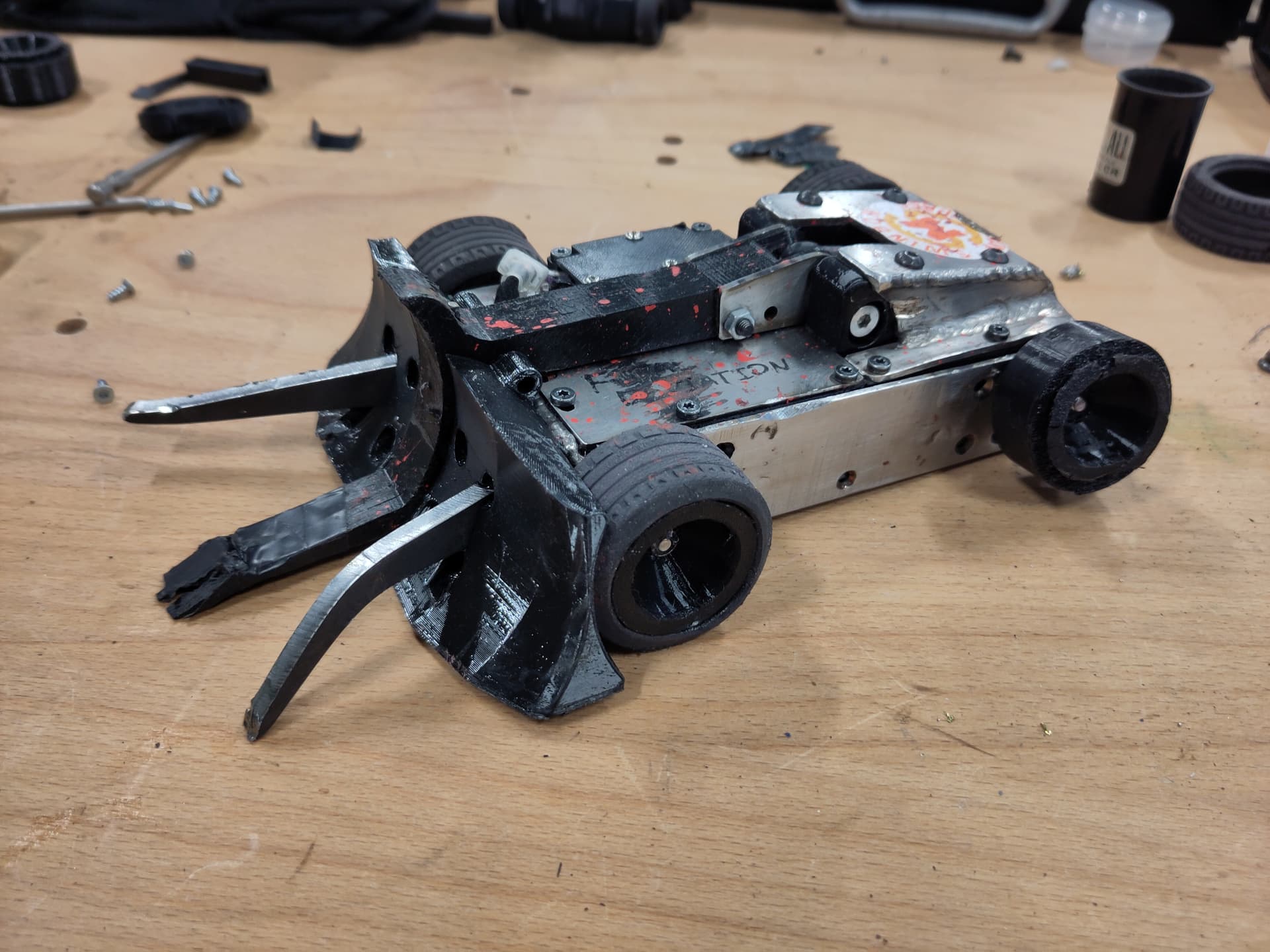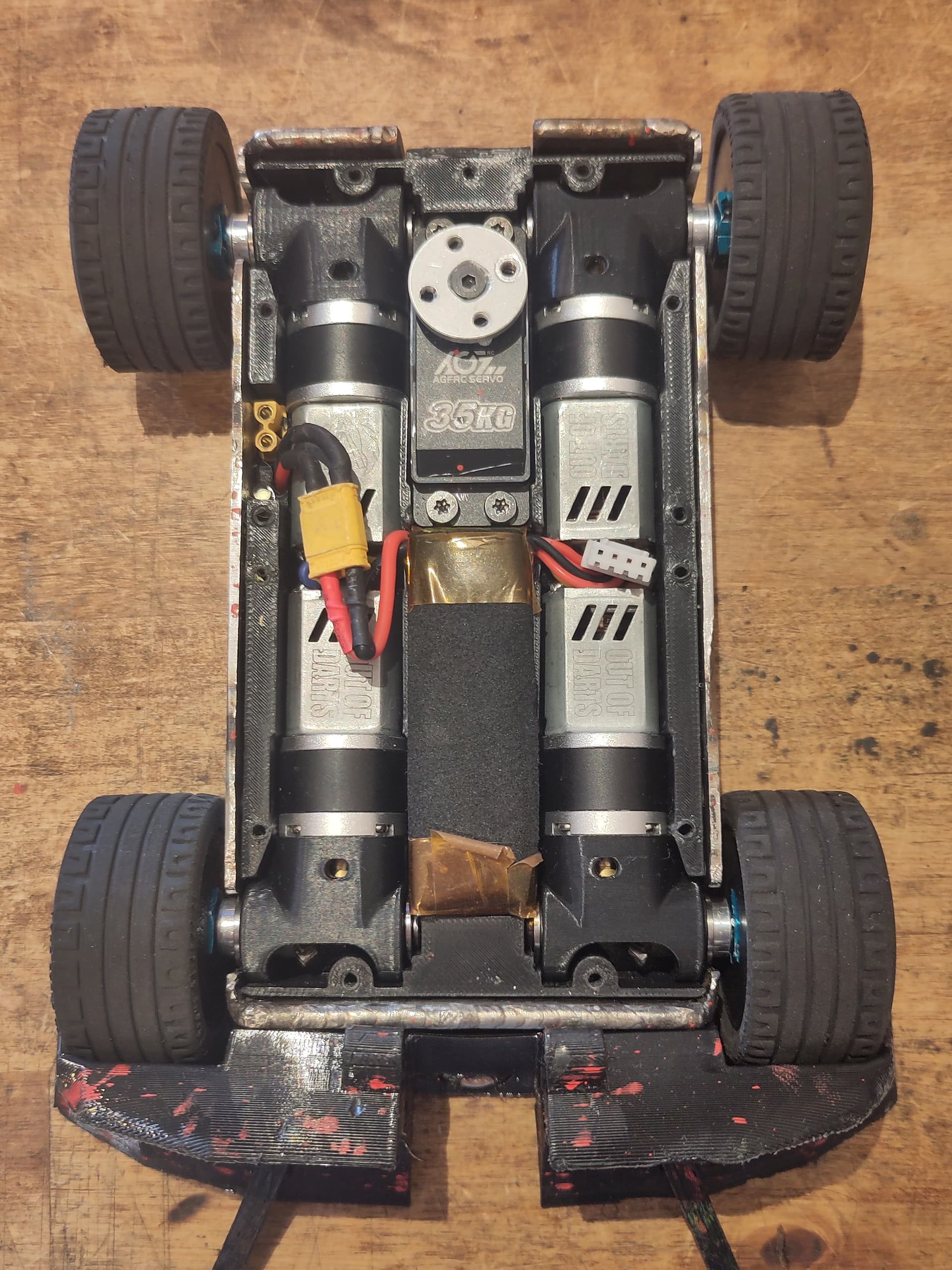 The main task then performs the drive mixing maths, either with actual IMU and input data if the radio is connected, or with zeroes if not, then queues the function that writes the drive values to the PWM controller/IO expander. If the radio is connected, the “input handler” is also queued, which actually just handles moving the weapon according to the toggle+button on the transmitter. Finally, some debug data is printed to the USB serial port. The serialBuf class I wrote is an extra serial buffer to keep messages ordered, because if you try to Serial.print() from two cores on the RP2040 at the same time all kinds of fun happens.