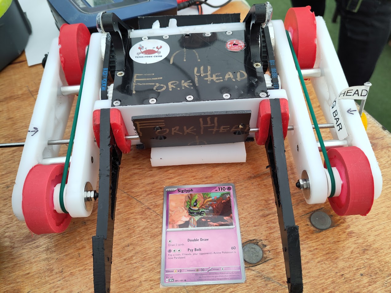 Later on and missing the end of one prong and the belt that actuated one drive pod I was able to hit the pit button. In the last 30 seconds I attempted to get Qry About It between the drive pods and push it towards the pit, but the combination of Qry About It’s sticky tires and the rounded rear armour on ForkHead meant this didn’t happen.