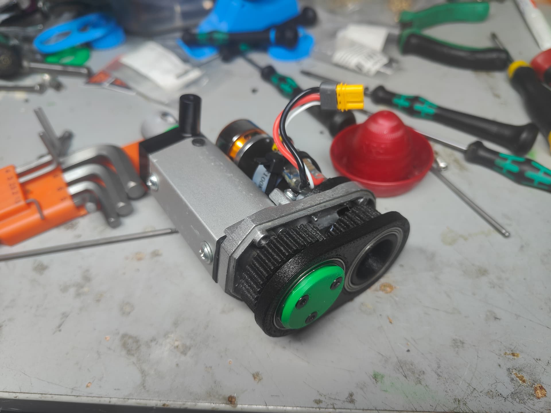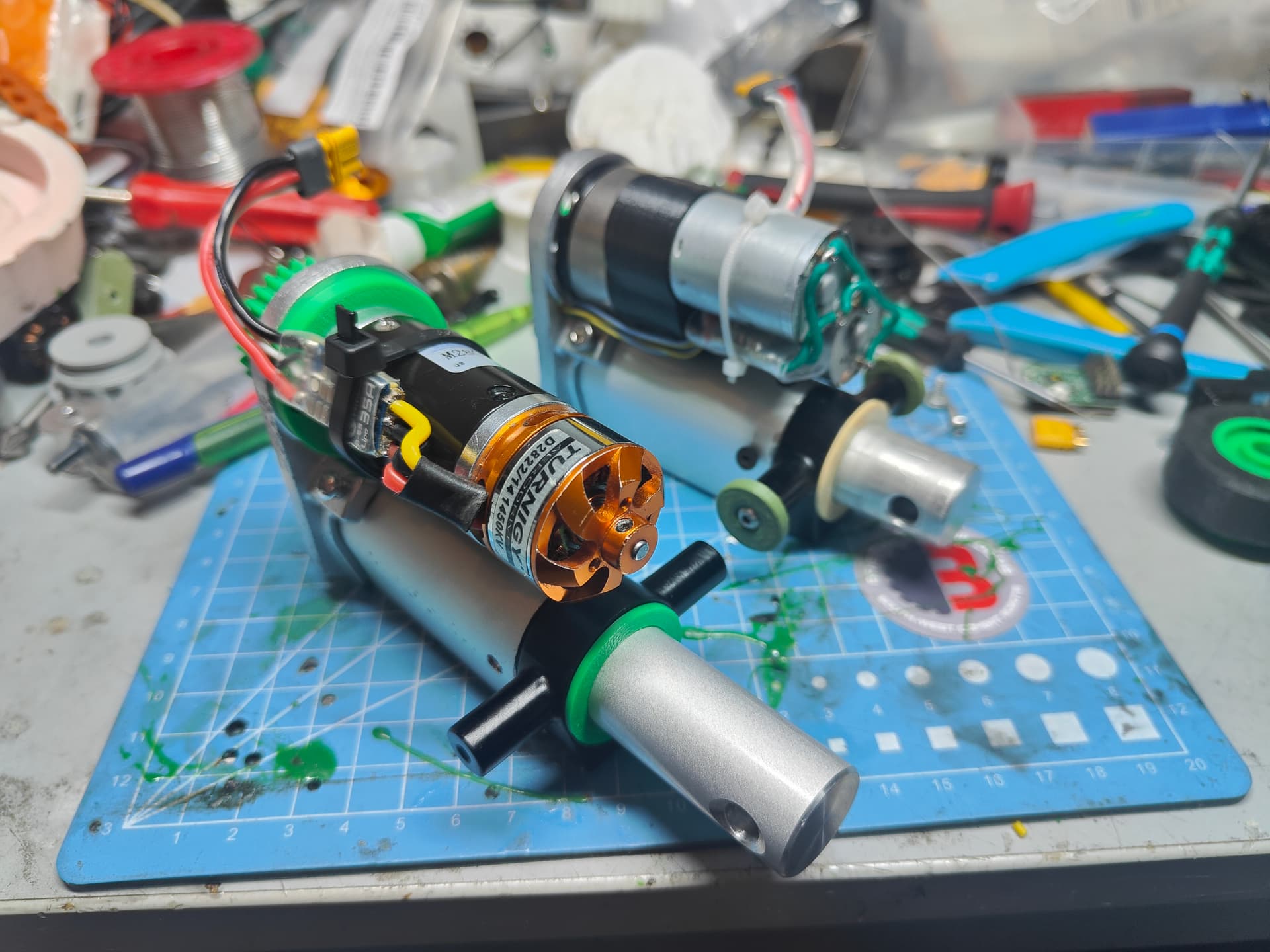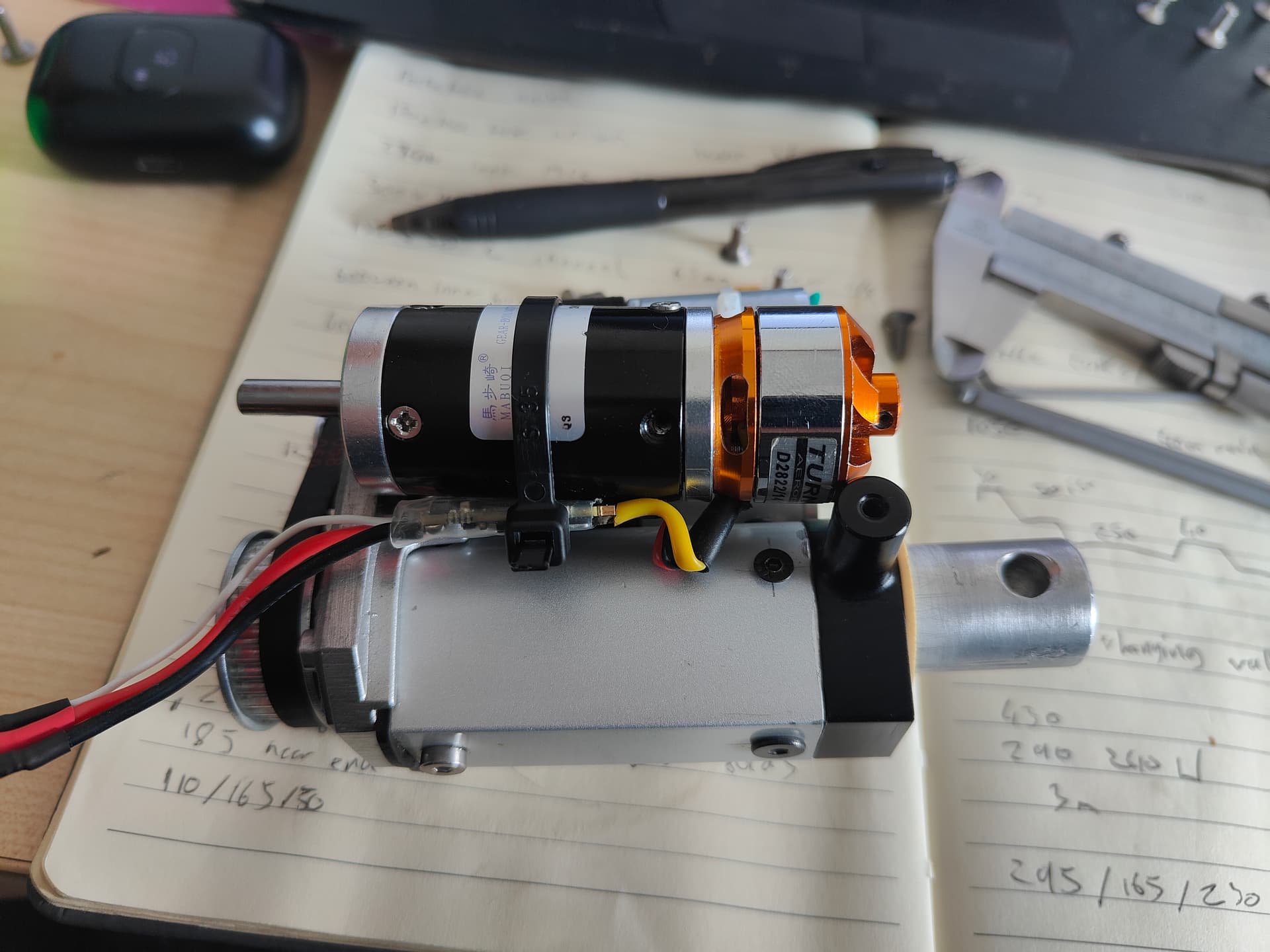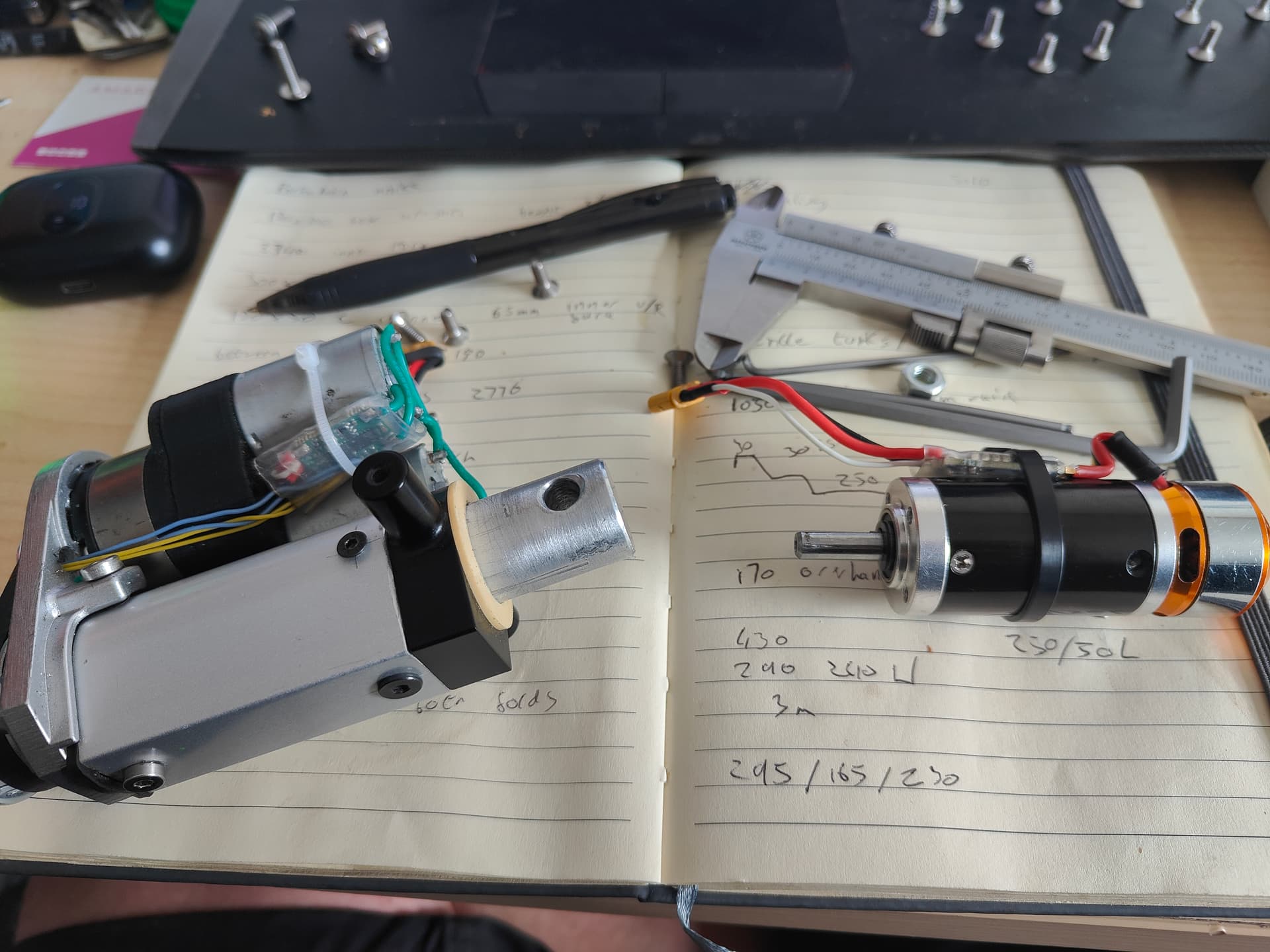 The two actuators side by side. Two very different approaches made many months apart. The second brushless one is honestly nicer despite its unbrilliant design, presumably because I knew what I was doing.