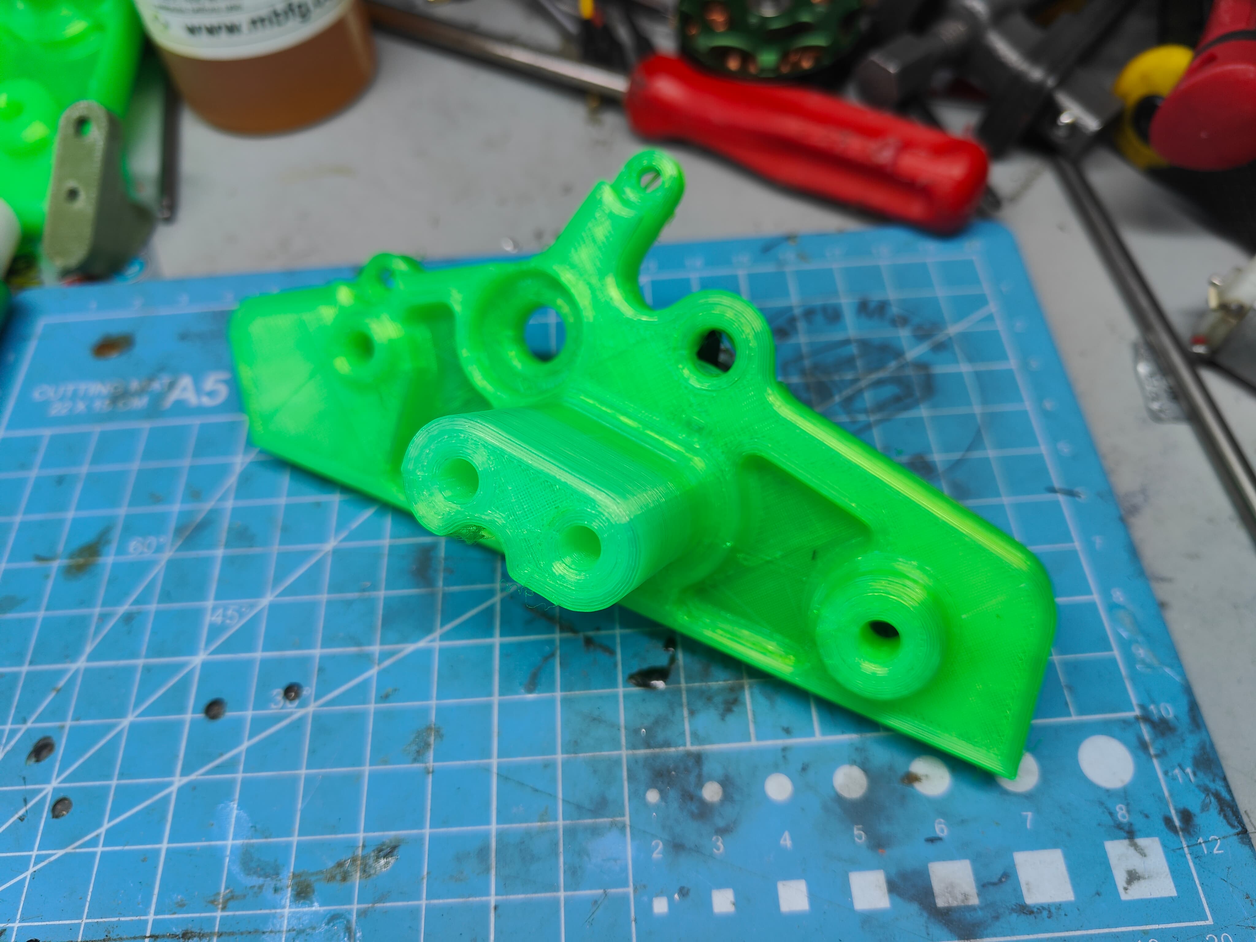 The printed nylon construction that has worked well for me for years was woeful. I think this is partially down to it being less forgiving with the part geometry on something like Nips compared to the small dense squares of MotherLoader or Klaus and the fact these were just printed badly. I’m not entirely certain what changed along the way but something certainly wasn’t up to scratch with the layer adhesion. The eSun nylon is generally pretty good at being flexible and impact resistant. These were not. Potentially fighting the weight and dropping the infill down didn’t help either. I think they had a thinner wall than previous parts too. Orientation was potentially something that needed greater attention also.