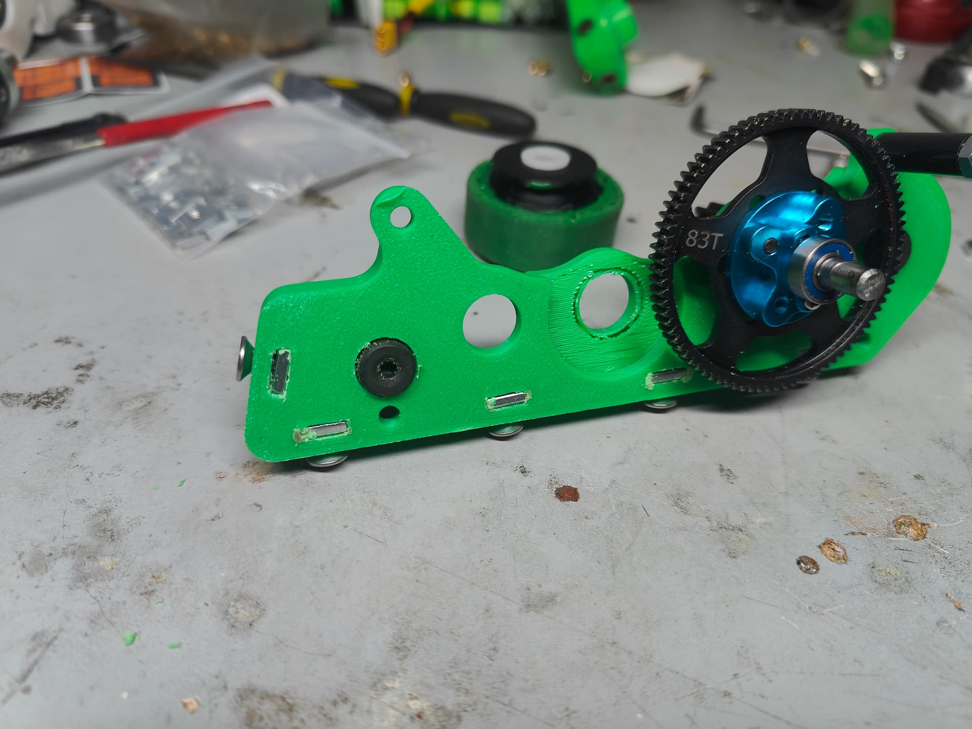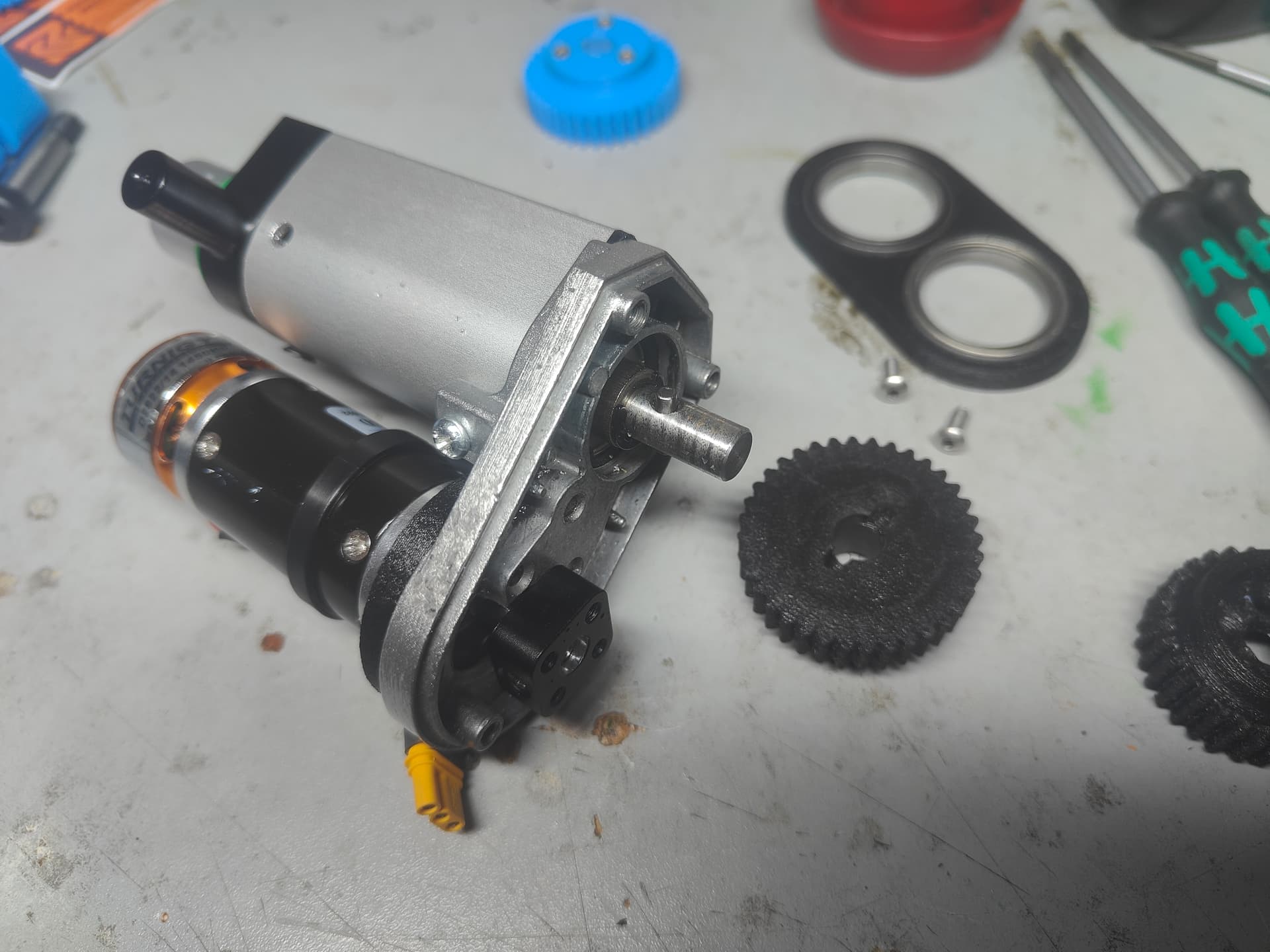 I took the opportunity to strip and re-grease the gearbox housing as I don’t think I took any pictures on the initial assembly. It is really painfully simple just using the stock pinions into an RC car spur gear. There is a little flanged 1/8” bore bearing pressed in from the rear and the rest of the assembly is just supported by the RC planetary gearbox. The housing is ABS and it still has those sinful heatpress inserts (which are still holding well!)