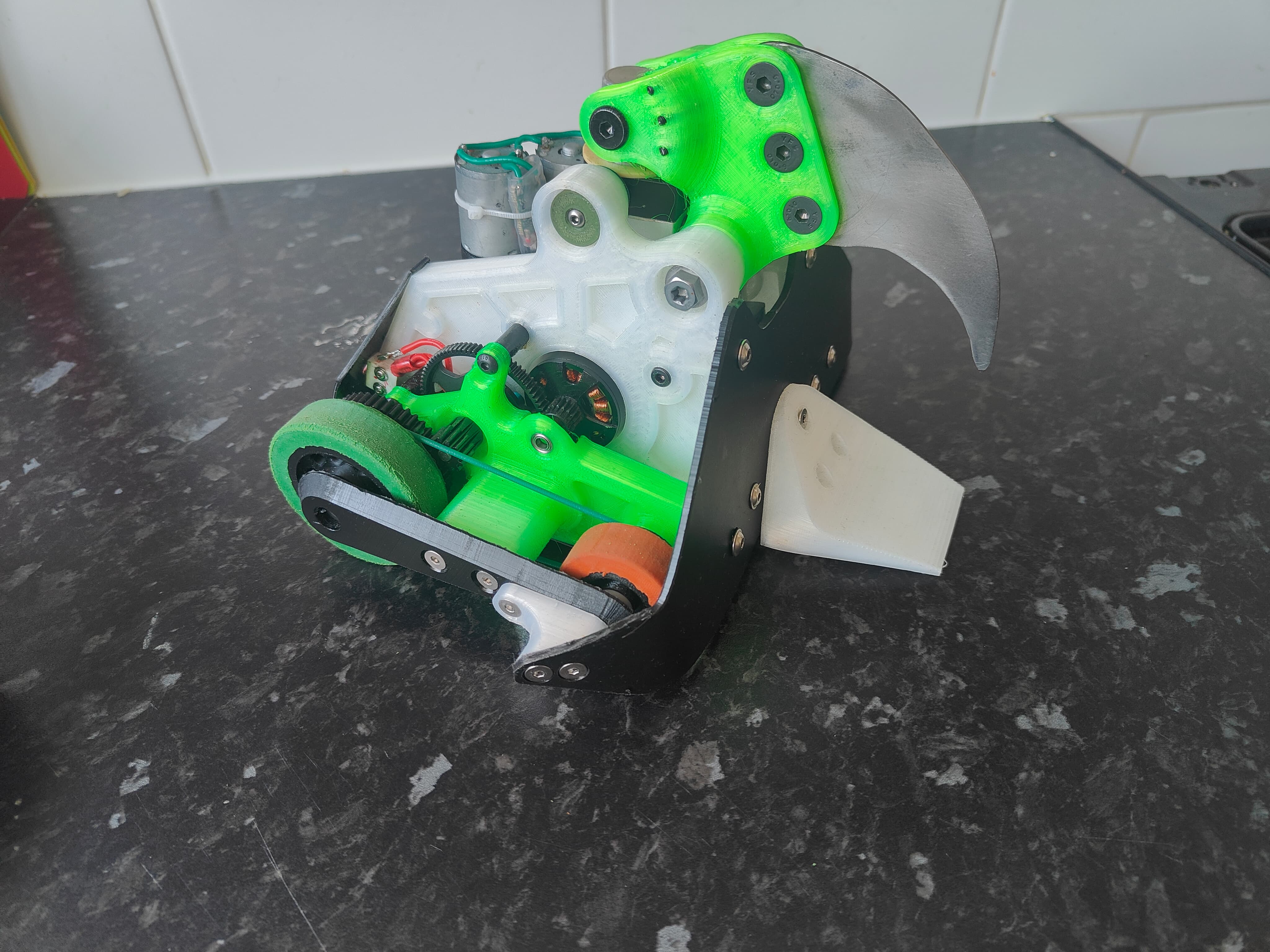 It was patched up with a 3mm HDPE plate bolted in place of the curved back panel with about 5 minutes to spare before it actually fought. I was putting the last couple holes in as I was summoned. Sunstroke is a dual horizontal spinner which I have been really loving from a novelty and appearance perspective.