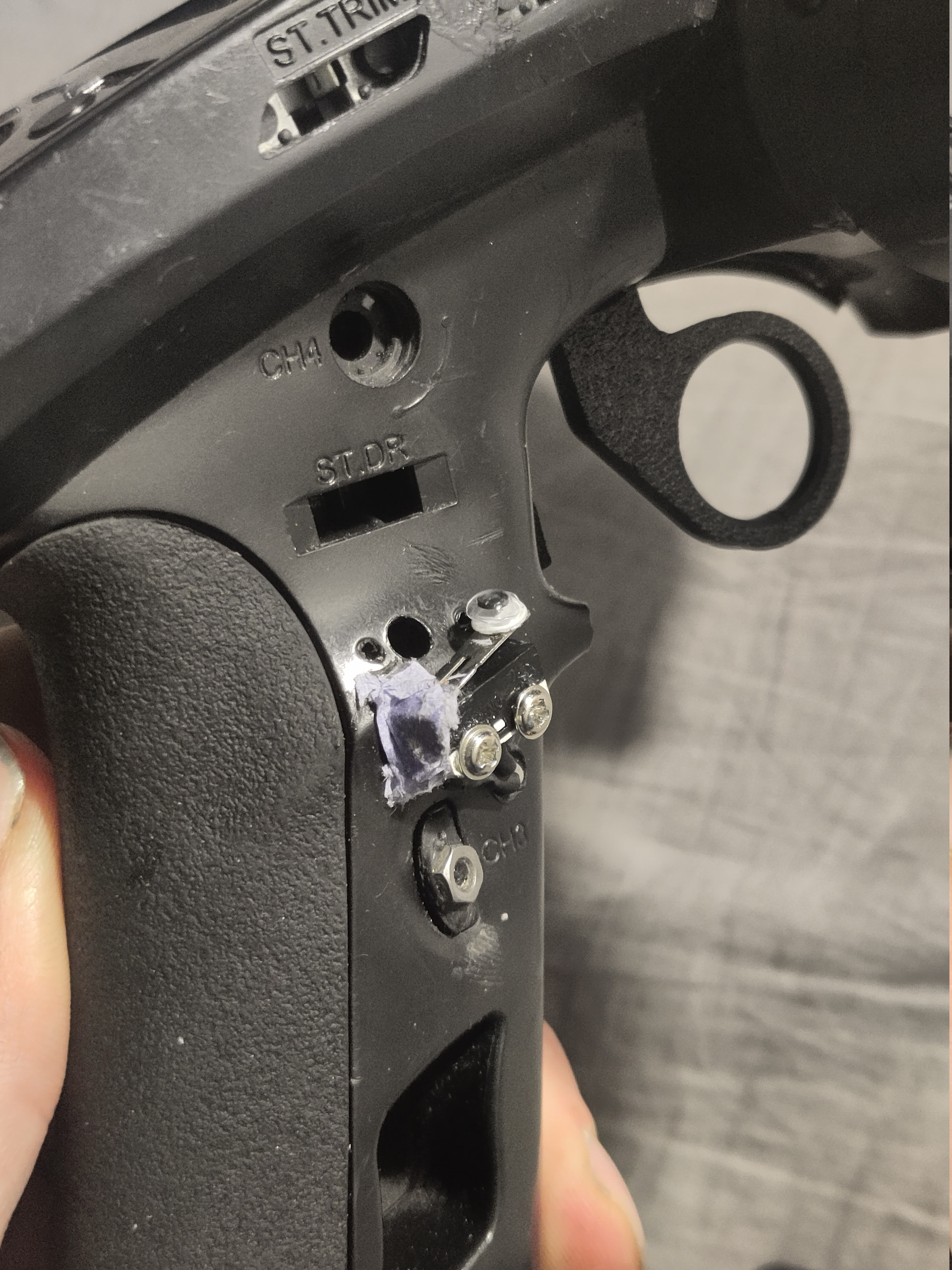 I also hot glued an M3 nut to the middle finger button, I use that for weapon on/off on the vert, with weapon speed on CH6. The microswitch is the “full send” button.