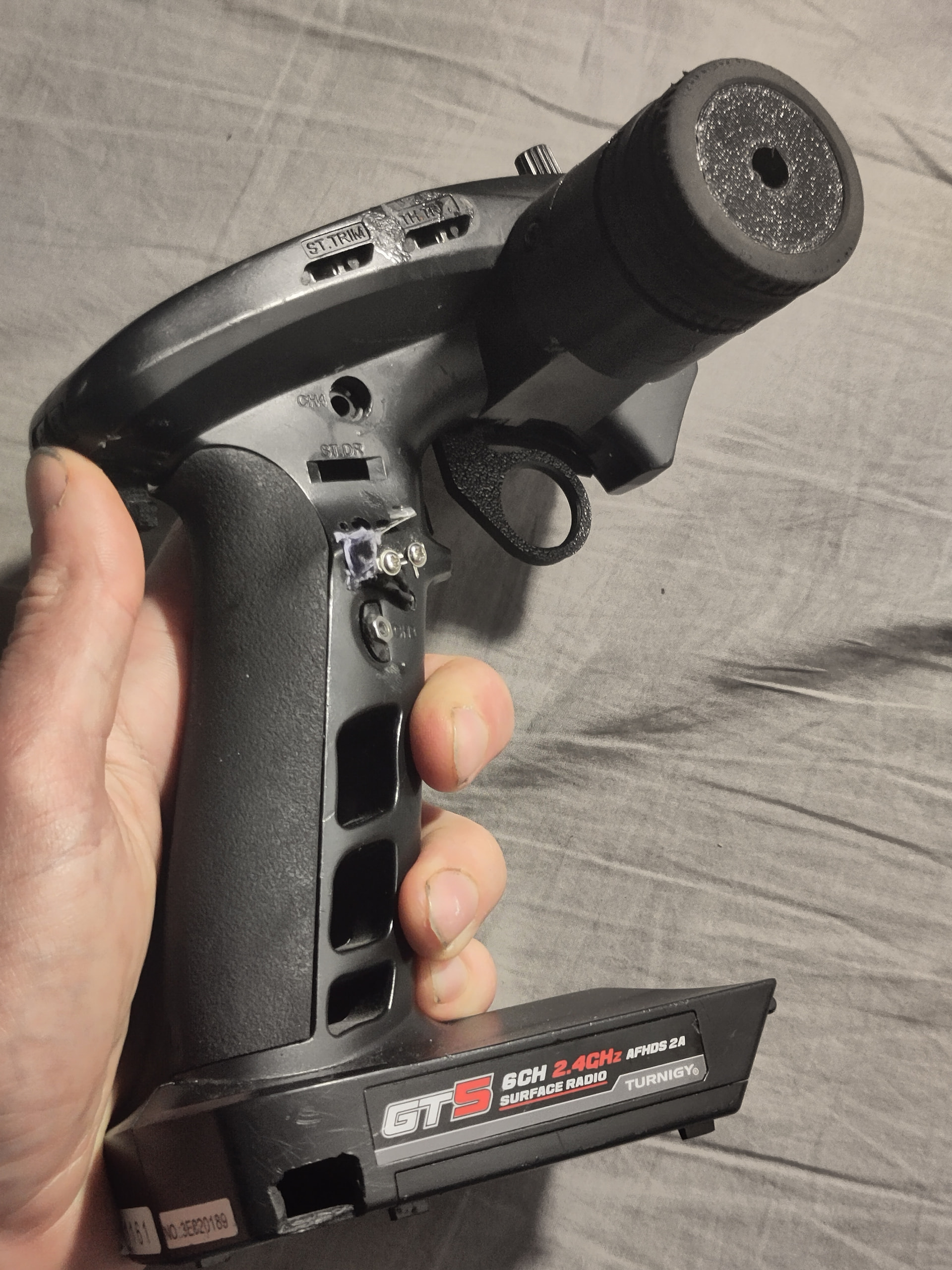 Welcome to the cursed GT5 club. I went through exactly the same process on mine. I really struggled to react quick enough with the location/action of the stock buttons and switches, and after some really frustrating events I started messing with it. Many attempts and many vestigial holes (ventilation for my sweaty palms) later I settled on a single microswitch under my thumb. Googly eye for grip, blue roll and superglue hinge because the lever fell off during my first fight at the last ORCS and it’s the only way I know how to fix things in a hurry. Finally feels natural and for the first time I can actually actuate a weapon when I want to, not when my finger or thumb eventually finds the tiny stock button.