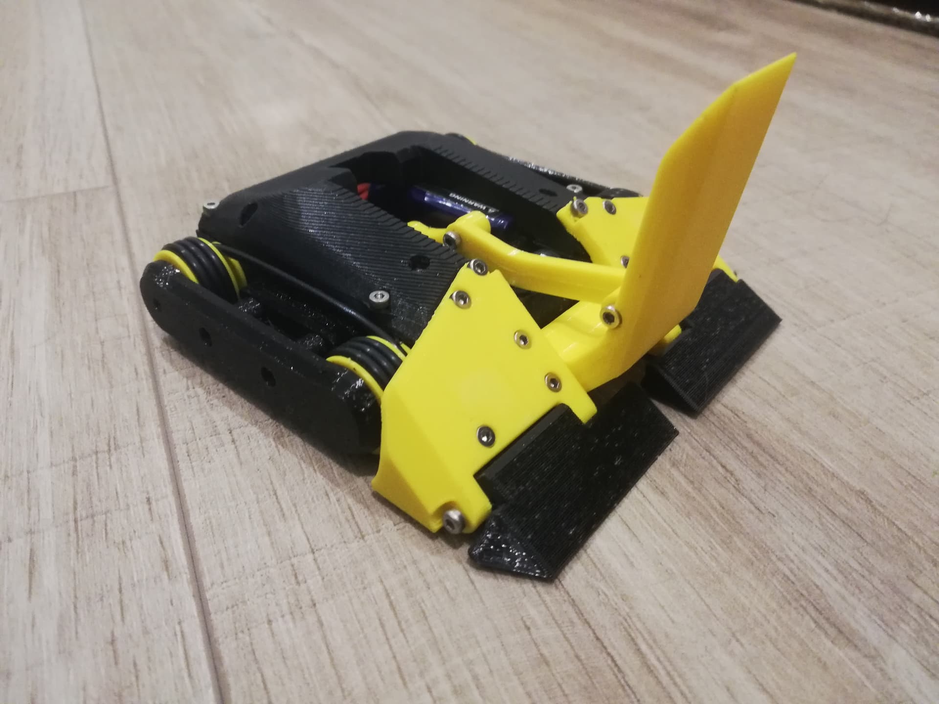 PLA Chassis and flipper, 300rpm Ebay motors, 2 brushed boat esc’s and a giant (For an antweight) 6 channel receiver. I’m also pretty sure it didn’t comply with the cube rule so it likely wouldn’t have ever been able to compete anyway not that it would have done well.