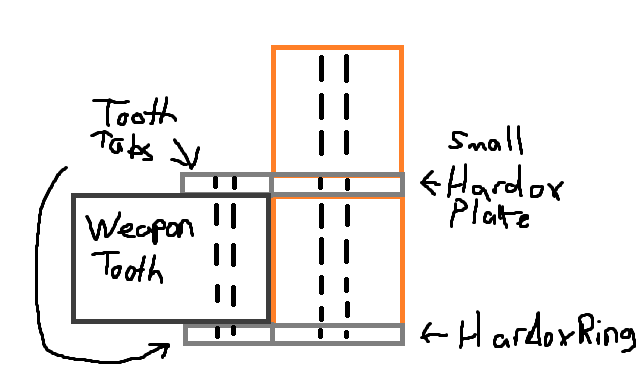 I figured I’d be a little more detailed on the small plate idea, unless it’s still the same problem, because I feel like there’s been a little confusion. It’ll be sandwiching a weapon tooth, rather than the small plate being a tooth, and I’m thinking about making a ring of HDPE on top of it all so that the sandwich is packed tighter.
