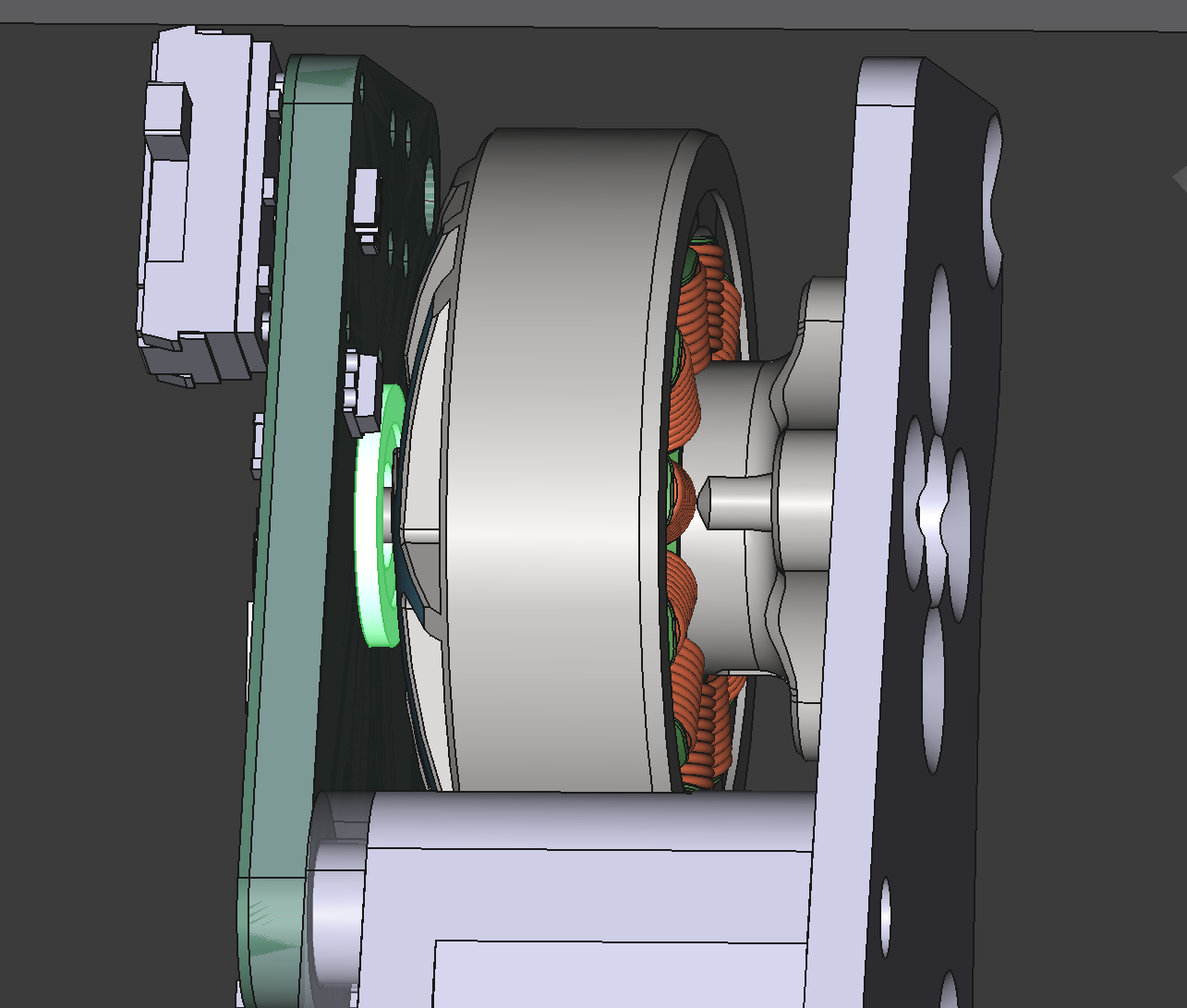 The motor is screwed to the frame piece on the right side of the screenshot, and a bronze bushing in a little holder (highlighted green) sits in a hole in the opposite frame piece, which is slid over the shaft and screwed into place, clamping the assembly together.