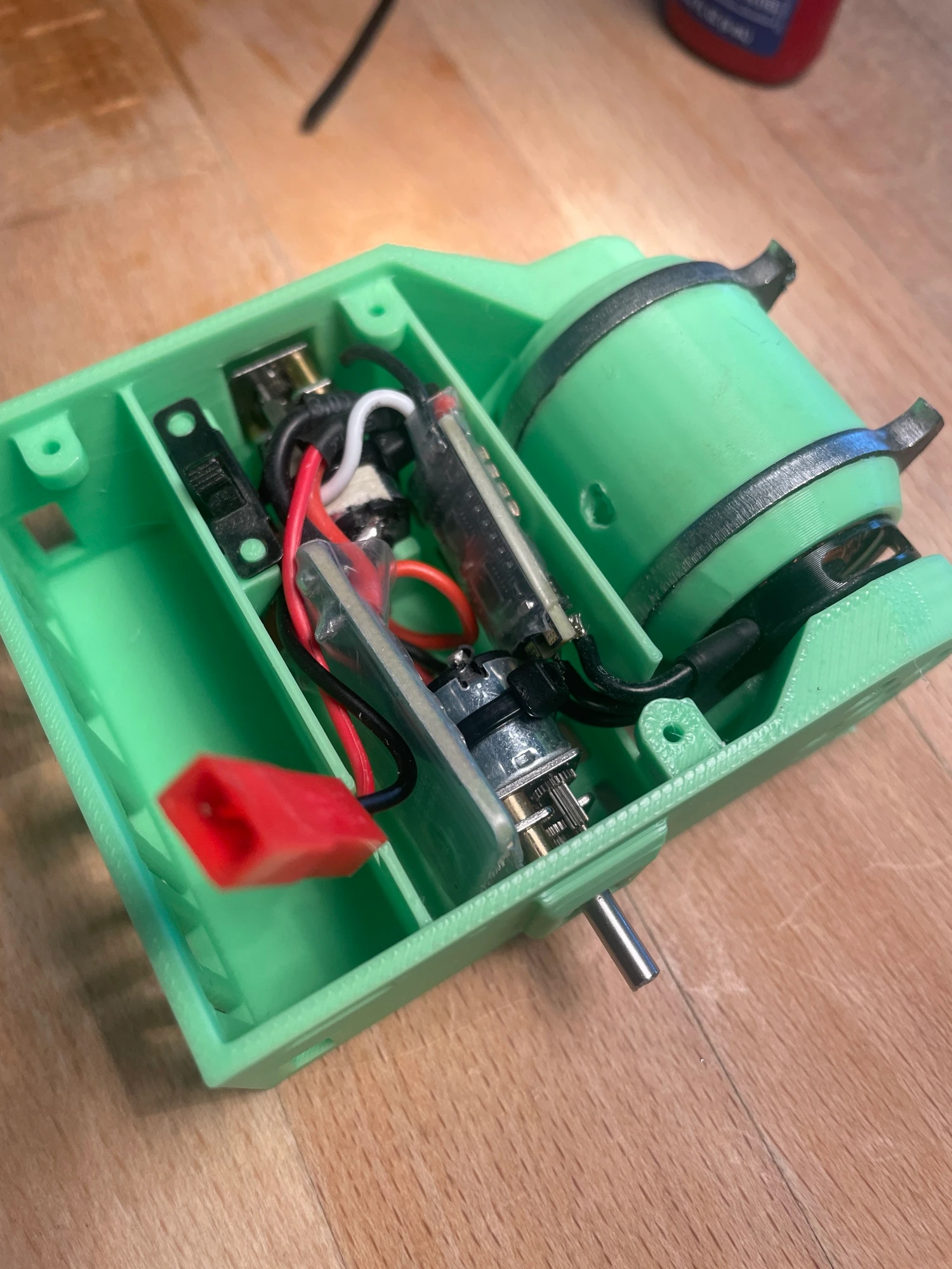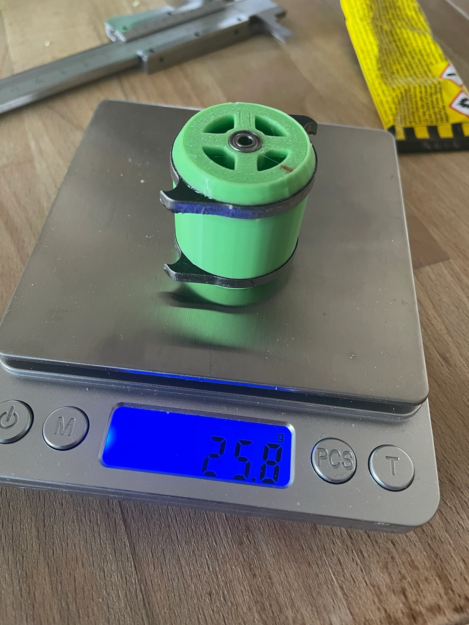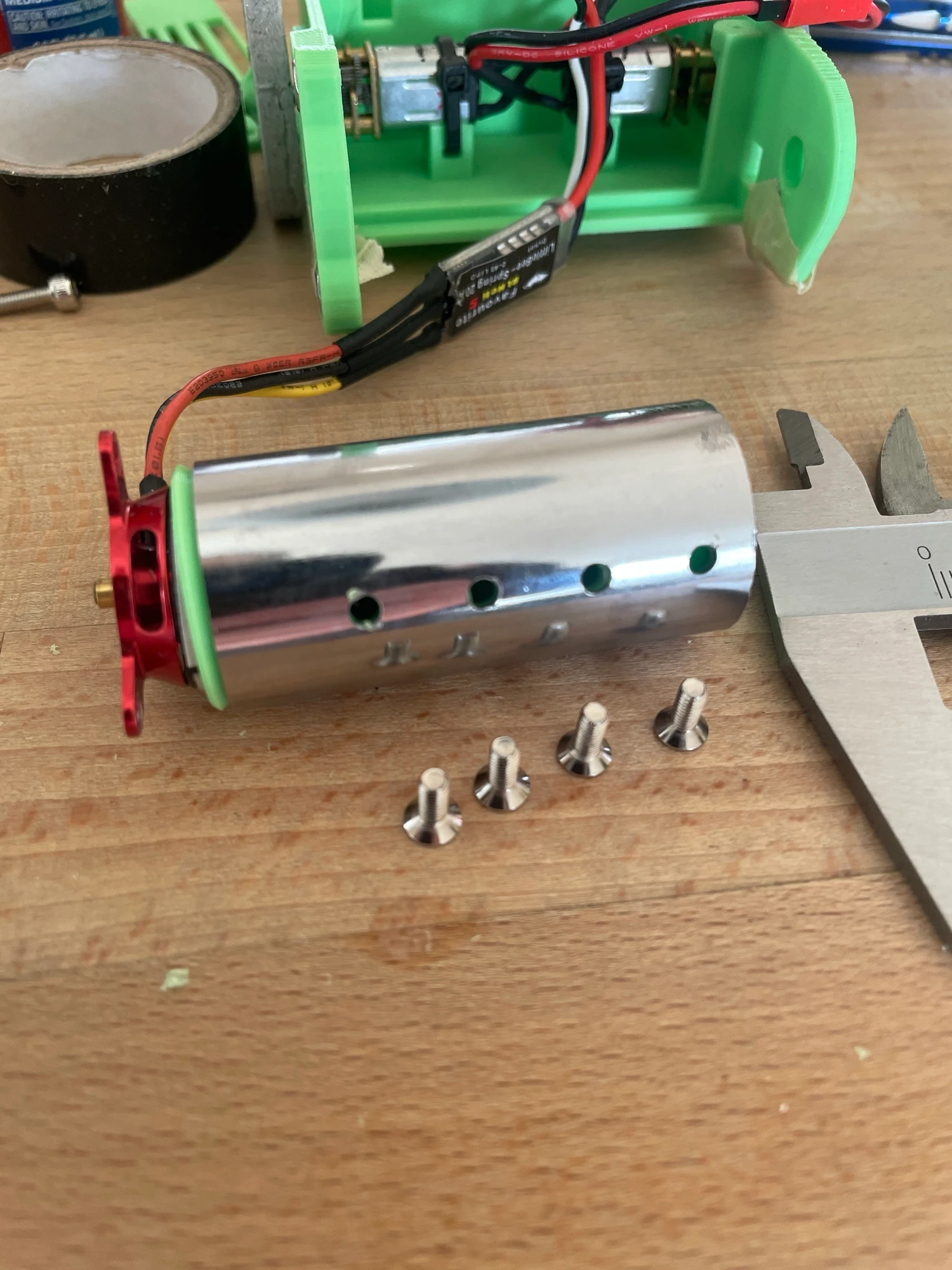 My original idea was of a wide belt driven drum spinner, with a pla+ inner core and a steel outer shell cut from a curtain rod for an extra layer of armor and coolness factor. But I had a difficult time sourcing ideal options for belts, so I went for the outrunner option instead.