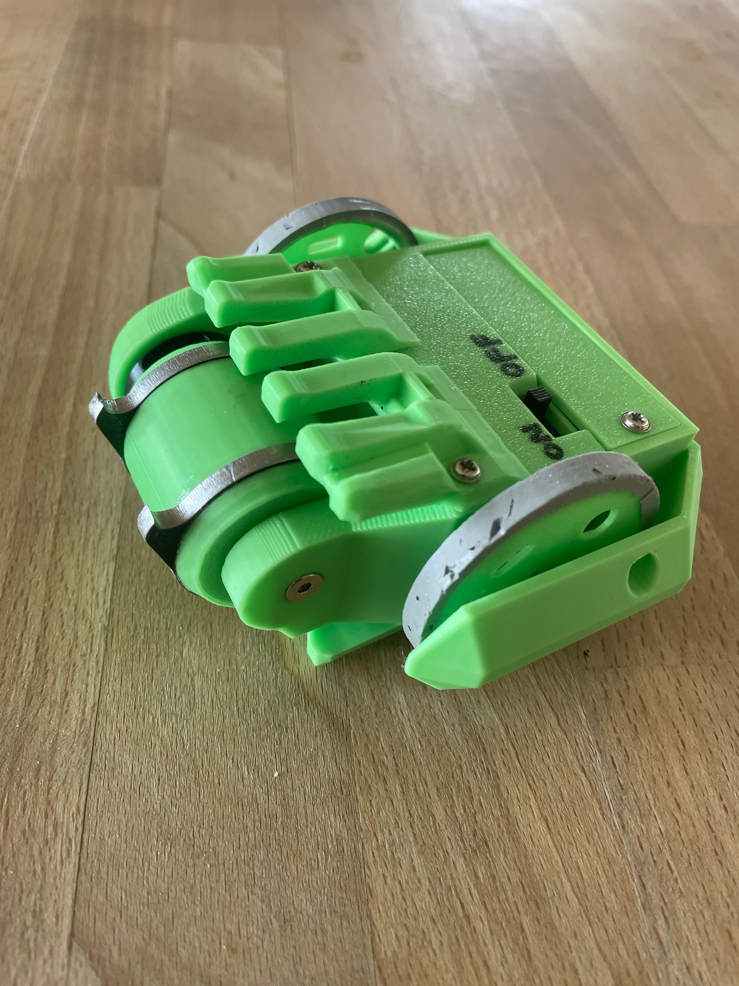 I needed some type of skis for running about without having the teeth making impact with the floor, so this is what I came up with. The wheels are made with bathroom sealant, crude but cheap and feels grippy enough!