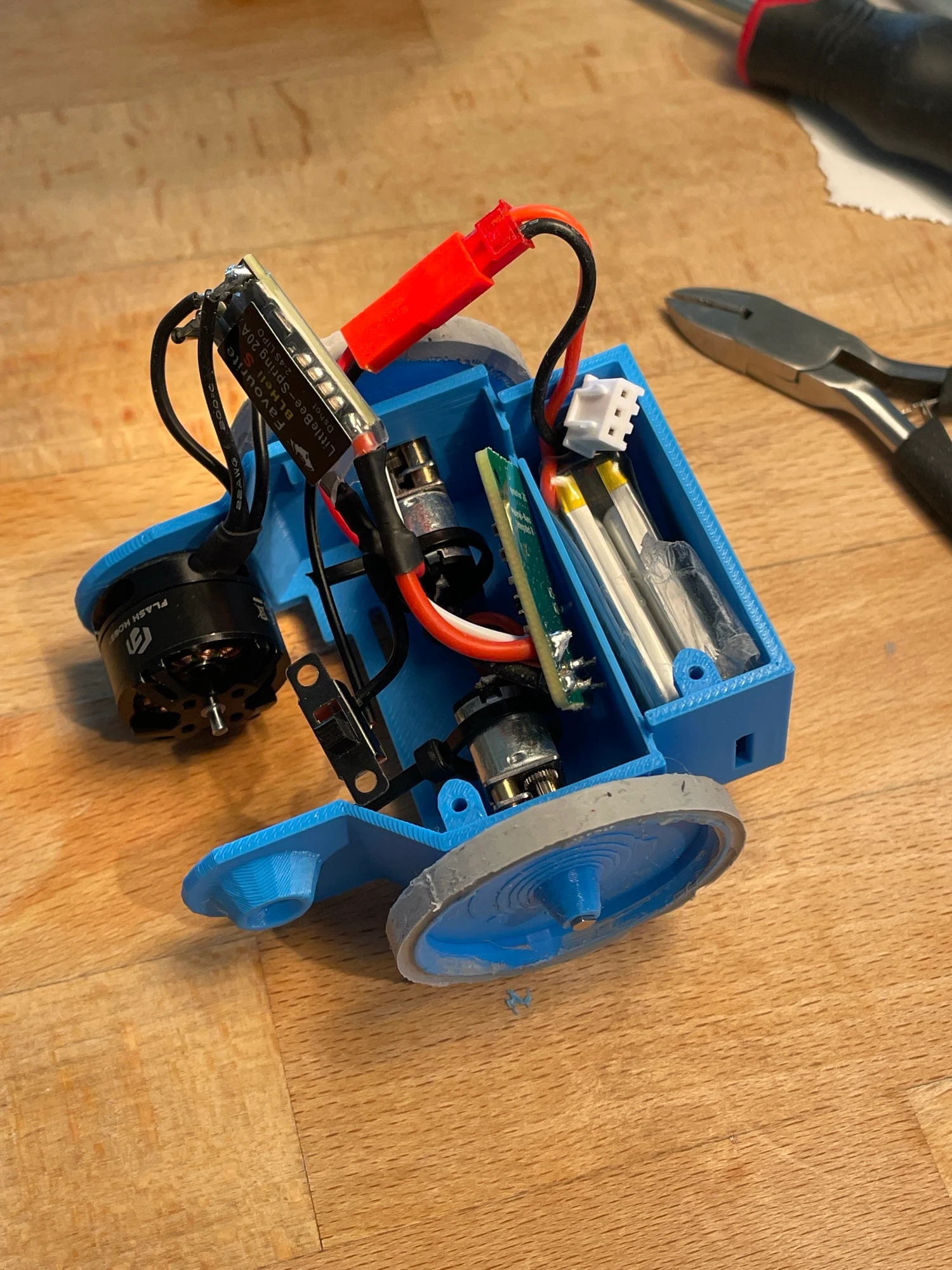 I decided to put the wheels in the middle, so I can do odd maneuvers and flop about to confuse the opponents and myself. The battery ended up in the back, but then I only have to avoid being hit from behind.
