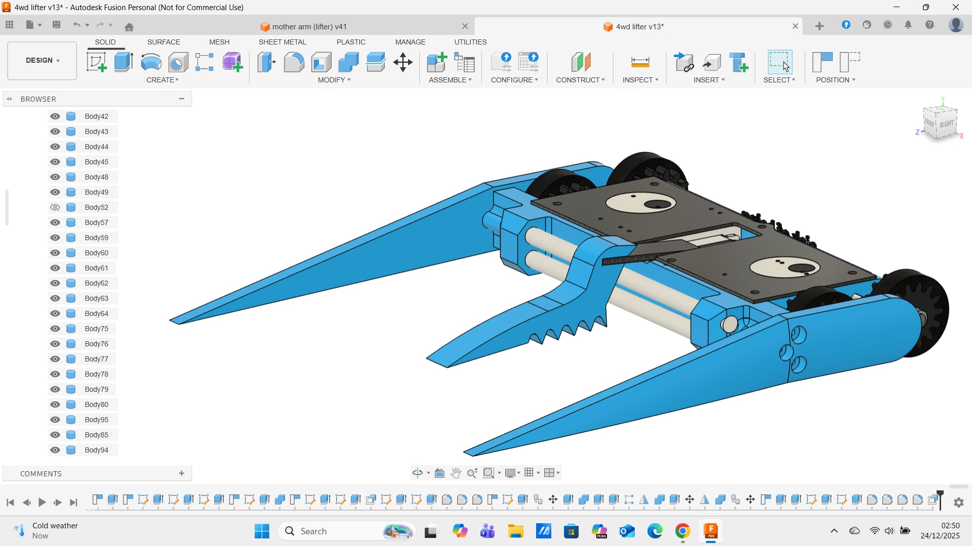 baleen forks to get under verts and large outer forks for corraling smaller bots (each robot is 300mm wide) this fitted our wanting to make them annoying and competitive so we decided to press ahead with these for champs. so a rush build was in order