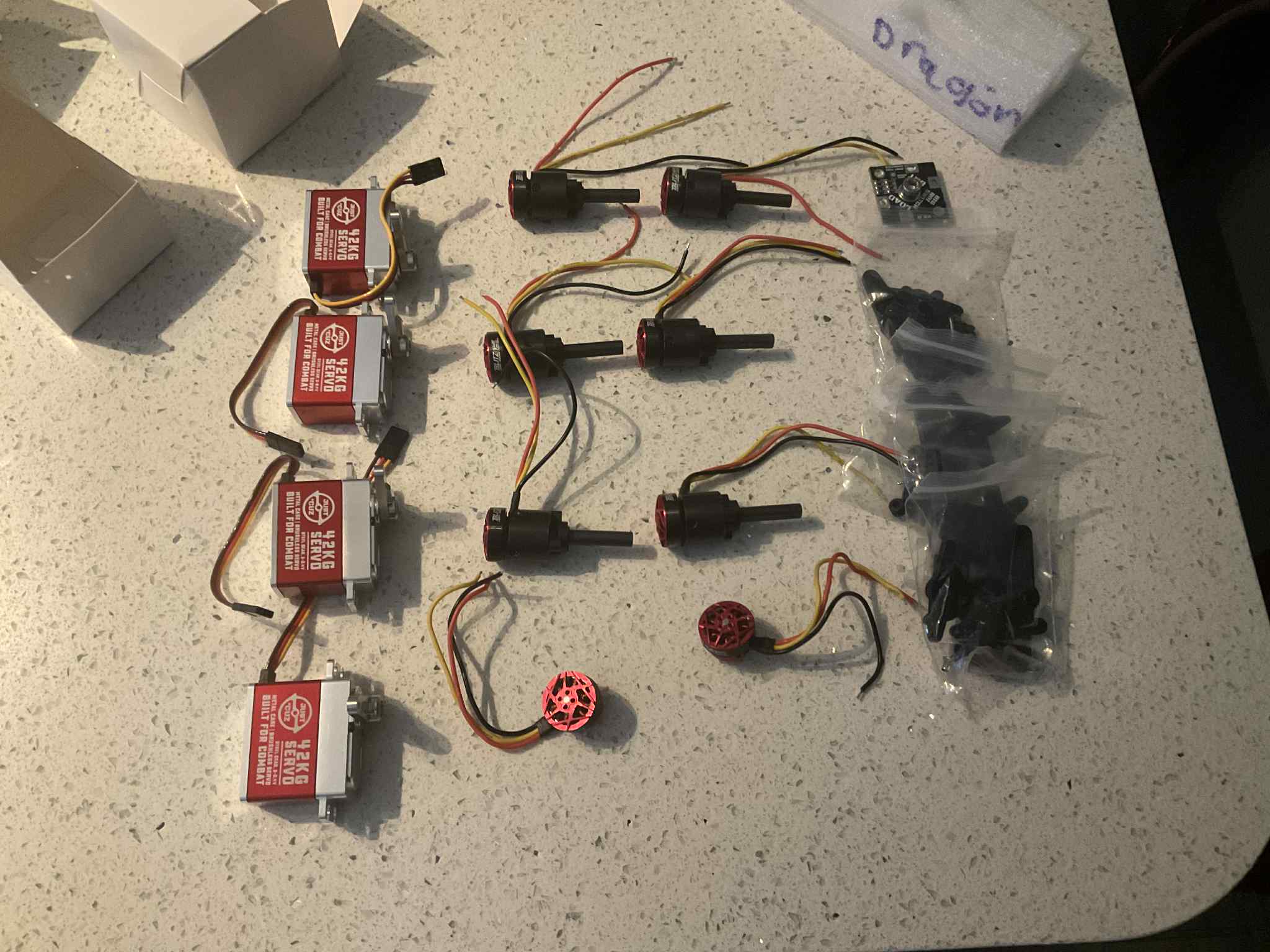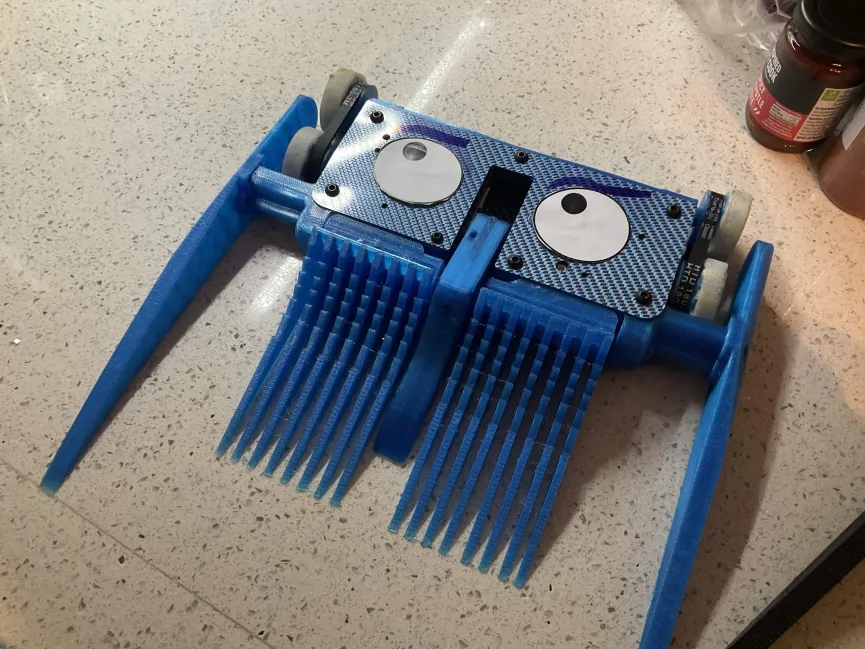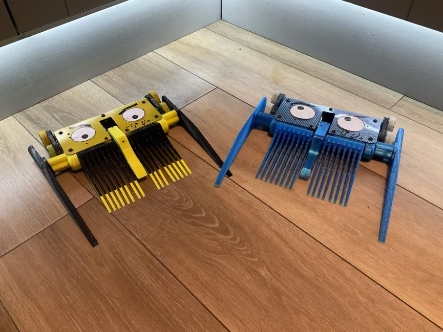 they are powered by repeat compacts with a 4s 450mah battery (could of been much smaller) and some lego bbb wheels from the store which gave excellent traction. they also use the same fork mounting system dolos uses with 8mm hdpe rods