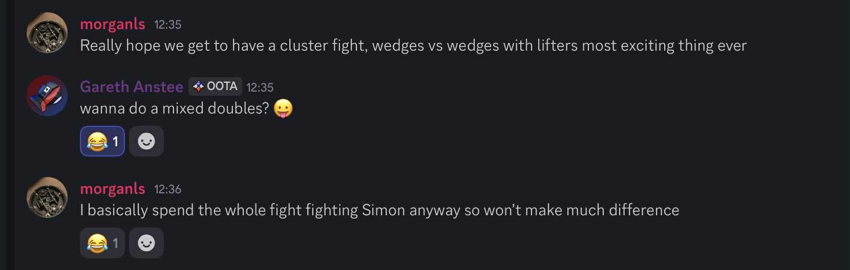all we wanted was a top 16 finish so between both our driving and my design “expertise” for the ground game we prayed for a kind draw and to not bring them back in a bin bag. we had 4 bots we really really didnt want to fight. that being mo-problems, swoop, wajoo and chopstick