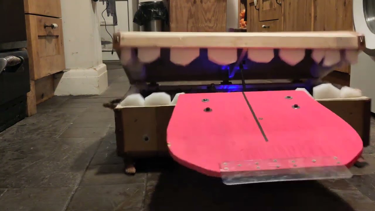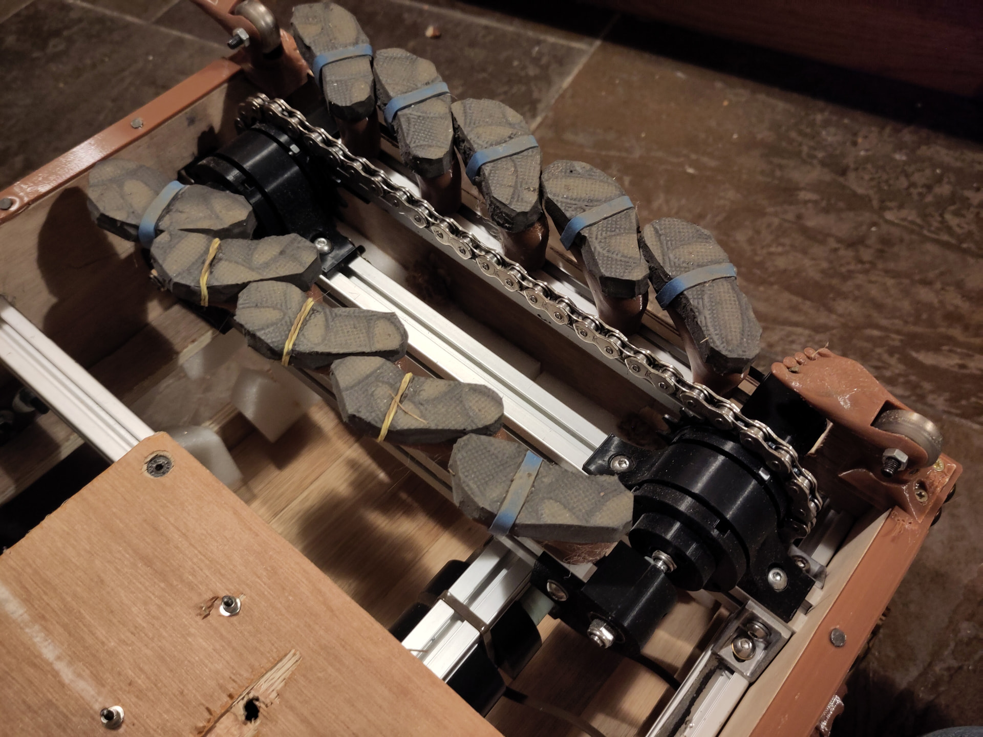 No shuffler bonus for BEVs, so severely compromised as an actual robot. Drive is via 2x Team SC drill motor/ESC combos powering a pair of extremely inefficient shuffler mechanisms (unless you consider “stompy noise” the primary output of the system, then it’s extremely efficient), with the front and rear cranks timed together via scrap bike chain, hopes, and dreams.