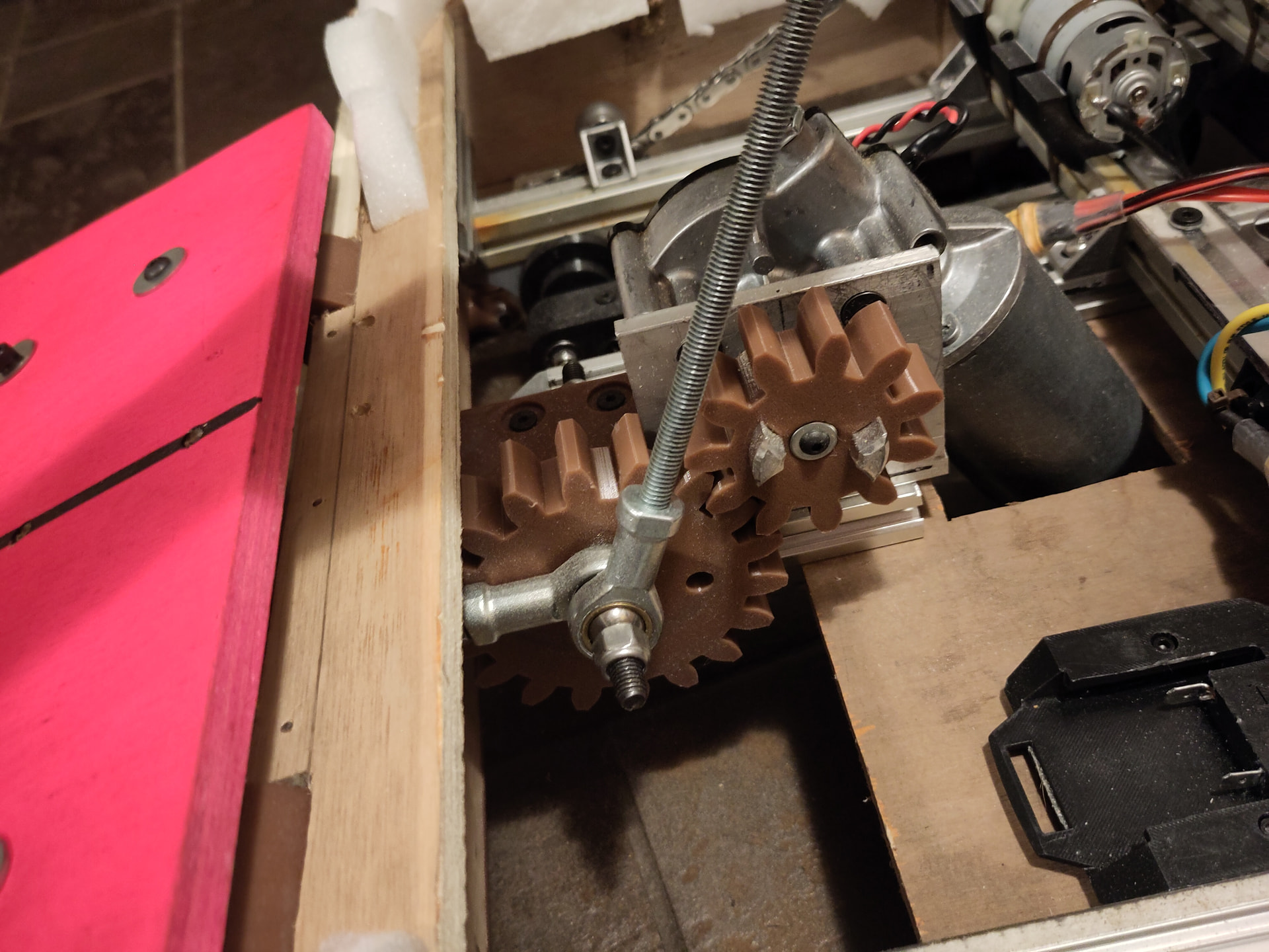 The tongue and lid mechanism are powered by an industrial worm drive motor, which is basically a car windscreen wiper motor but more expensive (if you don’t find it in the bin). TPU gears handle shock loading and stall protection by just skipping a bunch if the weapon motor stalls.