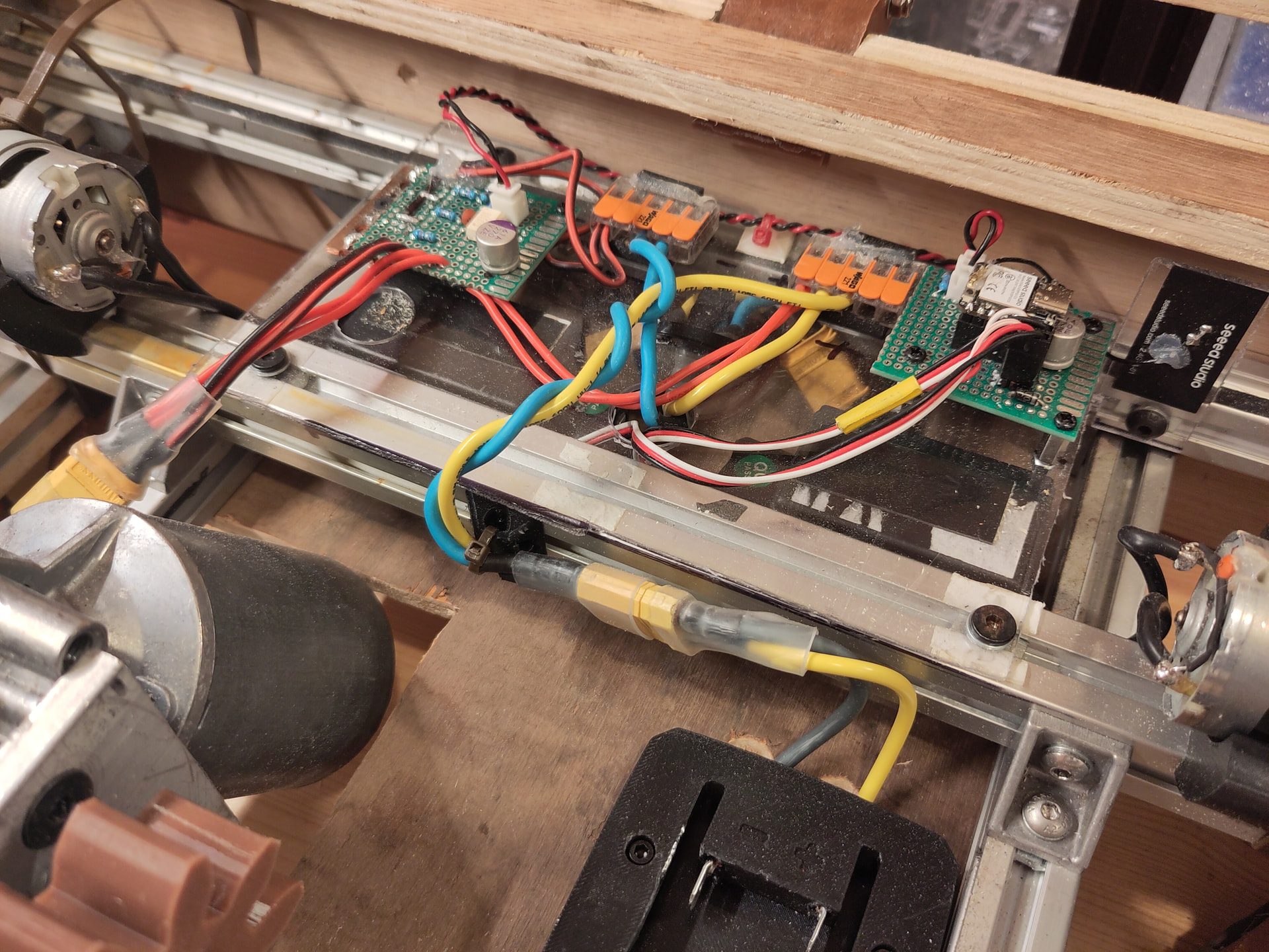 Radio setup is an ESP32C3 and a Google Stadia controller. Since the weapon system is continuous rotation I don’t need reverse, so I just used a handful of MOSFETs on some protoboard rather than shell out for a third ESC. Power is a 5S Lidl drill battery because I don’t have any suitable big lipos.