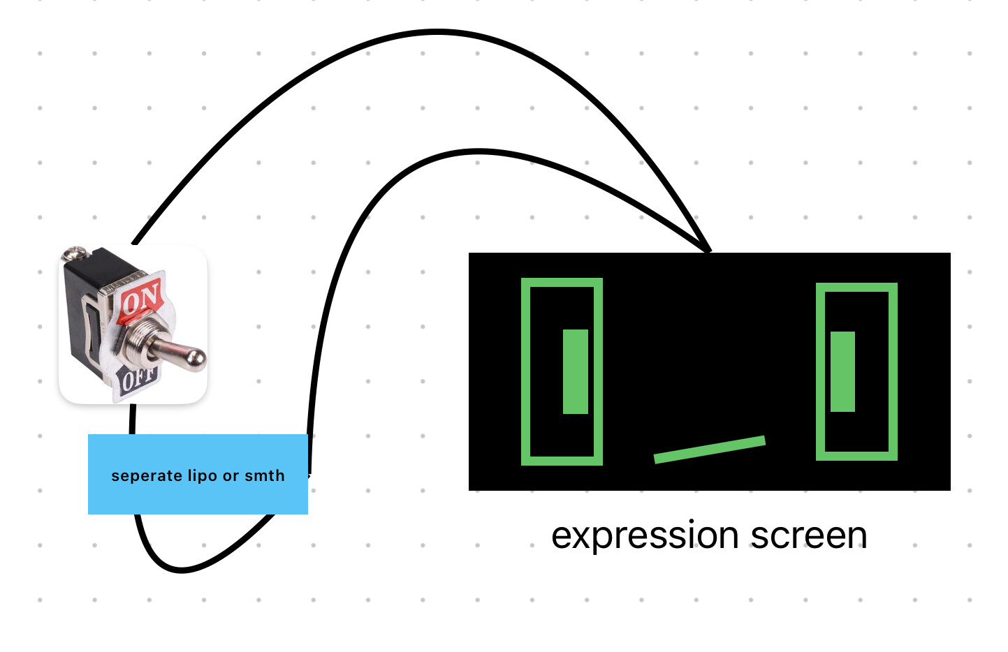 A seperate power source is connected to a screen (not accounting extra circuits), with the screen system having its own seperate switch which would cartoonishly be placed on the back. Probably useful for when the robot is a static display, yet the screen could be on for eye-catching purposes.